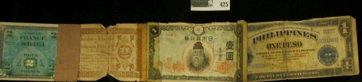 An original World War II Short Snorter note for "R.W. Wilson, on April 15th, 1945" done on a Series 66 Philippines One Peso Star Note, French Military Scrip, German note, and a Chinese banknote.