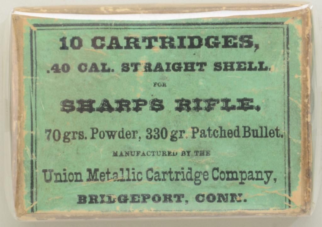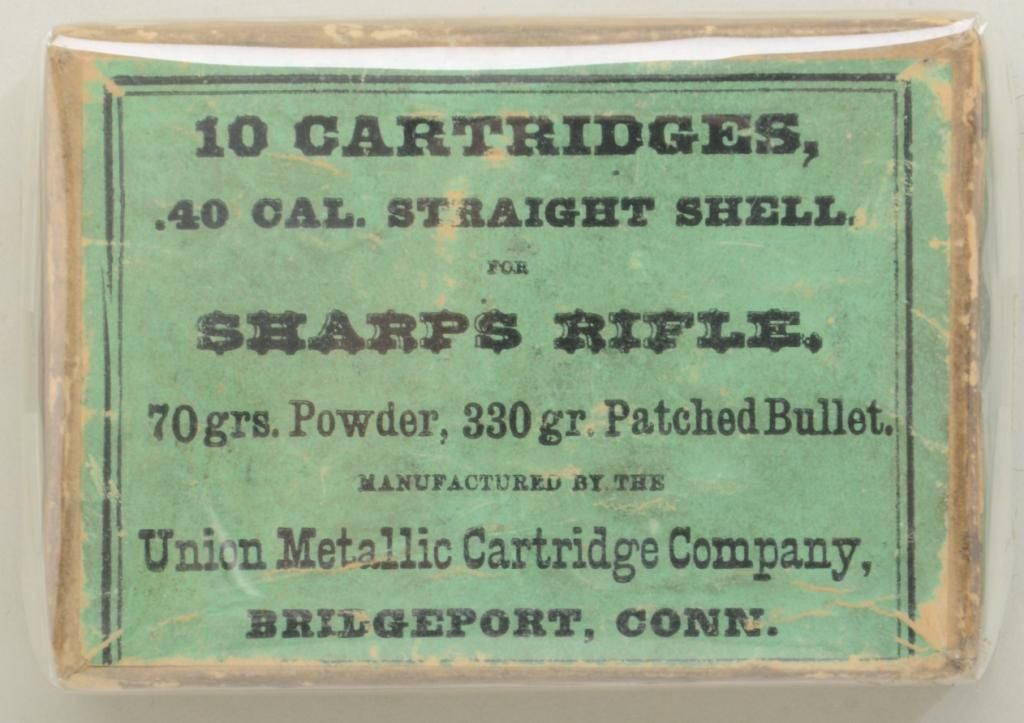 An original box of 10 cartridges, .40-70 Sharps straight, 330 grain patched bullet by Union Metallic Cartridge Company, opened but good, with good label, matching headstamps. Est.: $300-$600