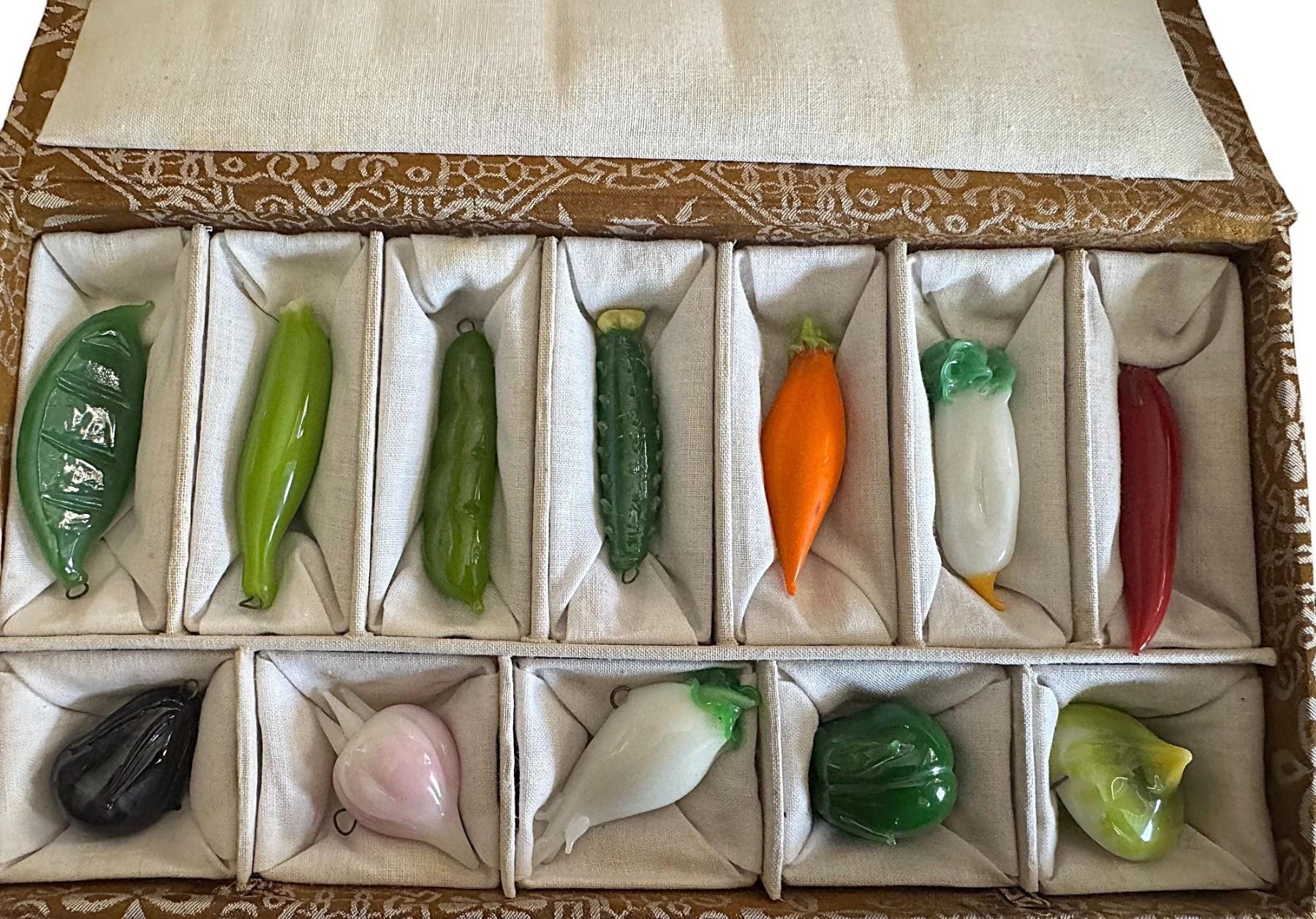 12 Medium/Large realistic shaped vegetable examples. This boxed set from the collection of Phyllis Ross of California boasts a nice set of 12 different vegetable examples with brass shanks all set into a silk tufted interior box.