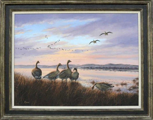 An original oil painting on artist board signed lower left Maass; measures 24” x 32”; condition is excellent; frame shows some nicks and is dusty. David Maass’s career has spanned nearly 50 years and is in the toptier of American wildlife artists. He was actively collected by Mr. Robert Petersen and is recognized nationwide. From the estate of Robert Petersen. Est.: $2,000-$4,000.