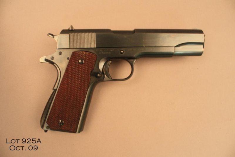 An outstanding near mint Transitional Colt Model 1911-A1 semi-auto pistol, .45 cal., 5” barrel, blue finish, checkered wood grips, #723796. This gun shows approx. 99% + original finish, R.S. inside a rectangle and P , T, and VP marks, finebore, action, markings and grips. A truly excellent example of this classic pistol. Est.: $5,000-$10,000