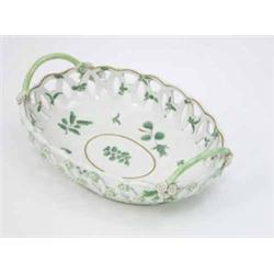 An oval Worcester basket, painted with leaves in green enamel, possibly by James Giles, twin hand...