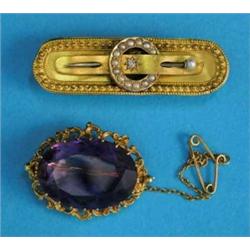 An oval amethyst brooch, in scrolled gold frame and a 15ct gold brooch with buckle motif set seed pearls and a diamond £150-200