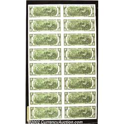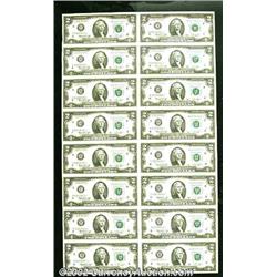 An uncut sheet of (16) 1976 $2 Federal Reserve Notes, Fr-1935-H*, AU. There are no hard folds in the sheet, but the front appears slightly yellowed, indicating that the sheet was perhaps framed and exposed to sunlight for a period of time. Some crinkling is present throughout and the corners of the sheet bear signs of having been mounted.