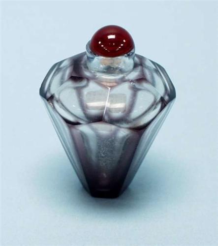 An unusual Chinese glass snuff bottle with hexagonal facetted conical sides. With cabachon ruby glass stopper. 150-200
