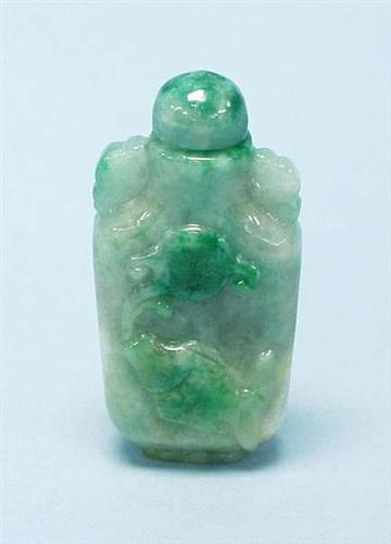 An unusual Chinese green jade snuff bottle. Rectangular flat form, relief carved with fish and crab. With scroll handles and matching stopper. 250-300