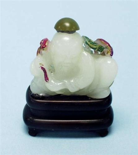 An unusual Chinese jade snuff bottle, carved in the form of a sitting hotei. With green glass stopper. On carved blackwood stand. 250-350
