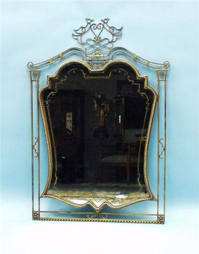 An unusual French gilt bronze framed wall mirror in the style of Gilbert Poillerat. The medallion shaped mirror frame with a pair of stylized birds for the crown. 43" high, 30" wide. Circa 1940.