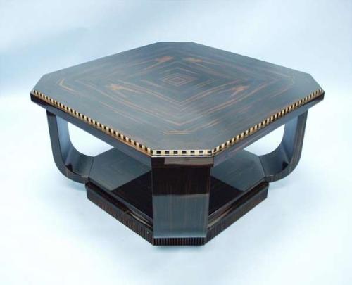 An unusual French macassar ebony coffee table. The square top has canted corners. The apron is inlaid with satinwood in a geometrical pattern. Top 31 1/2", 17 1/2" high. 5000-6000