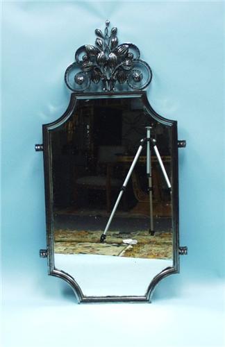 An unusual French wrought iron framed wall mirror. Of rectangular form with canted corners. Decorated with a pierce work floral crown. 43" long, 20" wide. Circa 1940.