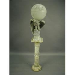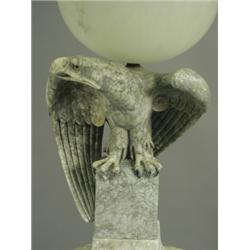 An unusual Irish marble pedestal lamp carved as an eagle supporting an alabaster globe shaped shade on a turned column, 1.7m high