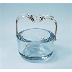 An unusual Scandinavian aquamarine glass ice bucket with Danish sterling silver grape handles. Si…