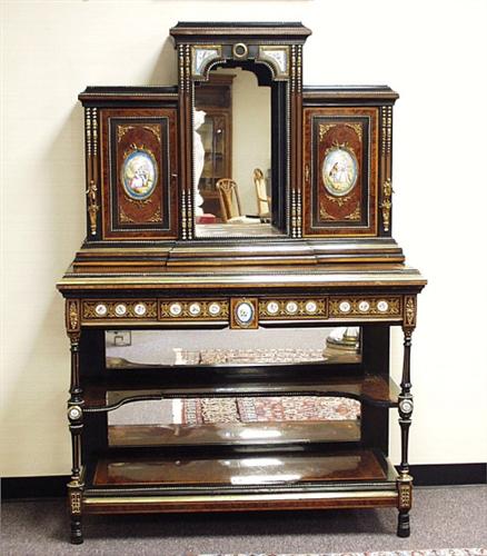 An unusual Victorian burled walnut inlaid gilt bronze and porcelain mounted secretary-cabinet. The mirror back central panel flanked by two closed cupboards, doors mounted with porcelain plaques and miniature bronze figures. 48" wide, 21" deep, 70" high.