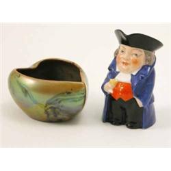 An unusual Zsolnay Pecs heart-shaped dish, satin finish with dark, mottled striations (3.5in.) and a Royal Worcester miniature Toby jug, shape 2831, date code 1933 - 3.5in. £100-150
