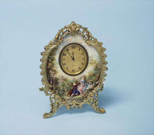 An unusual antique French Louis XV style gilt bronze and porcelain travelling clock. The gilt clock with Swiss movement and black lacquer Arab numerals housed in a cartouche shaped Sevres porcelain case, hand painted with a colourful figural garden scene. Gilt bronze easel support. Movement by Wegelin, Geneva. Marked. In original leather carrying case. 6 1/2" high. 7800-8500