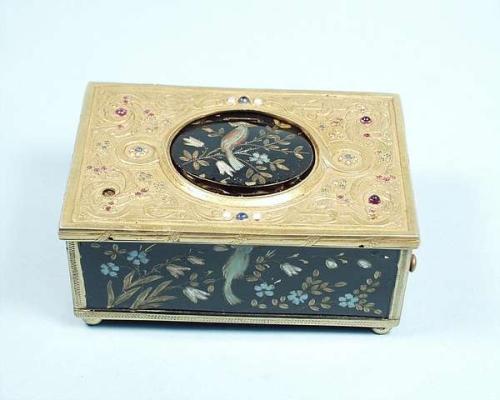 An unusual antique French enamel decorated gilt bronze musical box. Decorated with etched and enamelled birds, flowers and set with pearls and semi precious stones. With a central pop-up mechanical singing bird. 4" x 2 3/4". 4000-5000