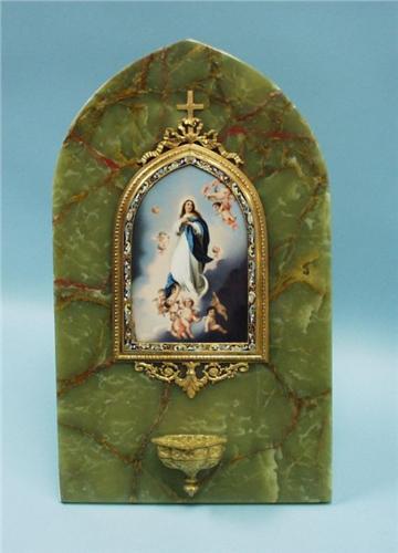 An unusual antique French medallion shaped onyx family altar. Mounted with a champleve and gilt bronze framed porcelain plaque hand painted with the figure of the Virgin Mary with angels. With covered holy water dispenser. On easel support, 12" wide, 21" high.