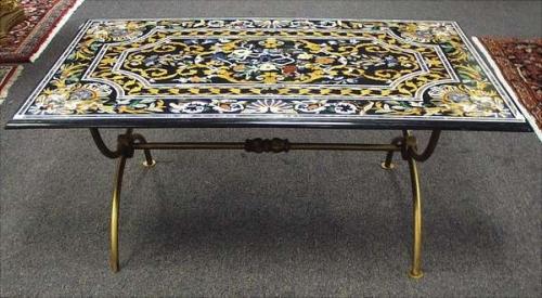 An unusual antique Italian pietra dura inlaid salon table on black patinated iron support. The rectangular top is inlaid with multicoloured floral and bird motives within a double white and brown border. 47 1/2" long, 29 1/2" wide, 20" high. 12000-15000