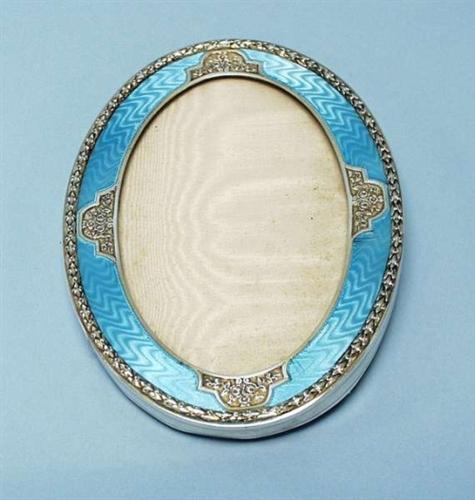 An unusual antique silver and enamel frame. Oval form with sky blue enamel matting decorated with silver floral medallions and side frame. Hallmarked. 6 1/2" x 4 1/2". 1200-1500