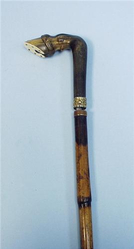 An unusual bamboo walking cane. With carved horn handle in the form of a hoof, mounted with a gilt ring. Insert with steel dagger. 34 1/2" long.