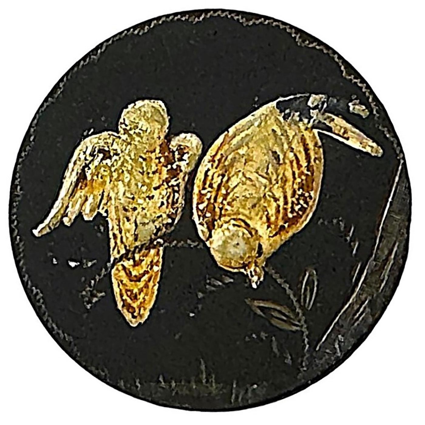 1 Large 19th century tole and lacquer button. This is an unusual example of tole and lacquer work on a brass button. The back and front are blackened and engraved with tole work while the two fat birds pictured are gold lacquer paint in the center of this cool button. Some minor wear.