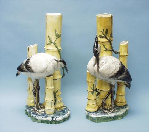 An unusual pair of antique Austrian hand painted faience floor vases in form of stylized bamboo stalks. Each base sculpted with the hand painted figure of a heron. 26" high.