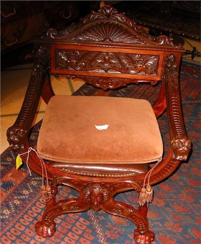 An unusual pair of antique French framed Savanarola chairs. The elaborate back and wooden armrests are relief carved with scrolls and shell motifs. Raised on lion's paw feet. The seat is velvet upholstered with loose pillows. 1500-2000EA.