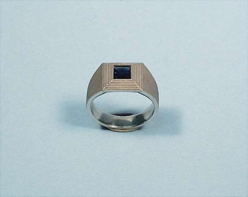 An unusual platinum and sapphire men's ring. Geometric design, set with a square shaped natural facetted sapphire. Total approx. weight 15.6 grams. 1800-2500