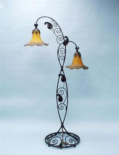 An unusual wrought iron and art glass floor lamp. The winding black patinated base with pierce work floral decorations mounted with two orange shades each in form of a large tulip. Fully signed Muller Fres, Luneville. 74" high. 15000-20000