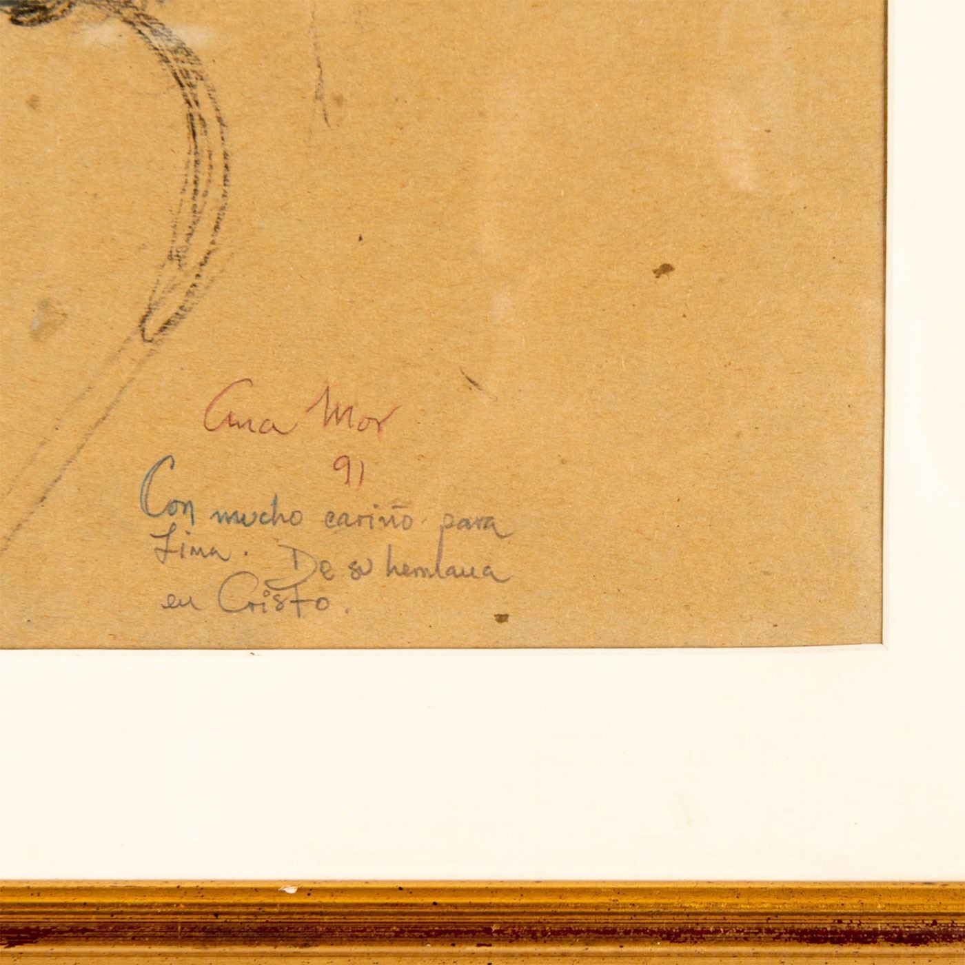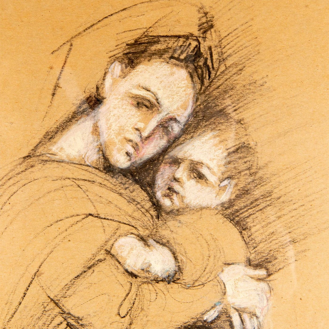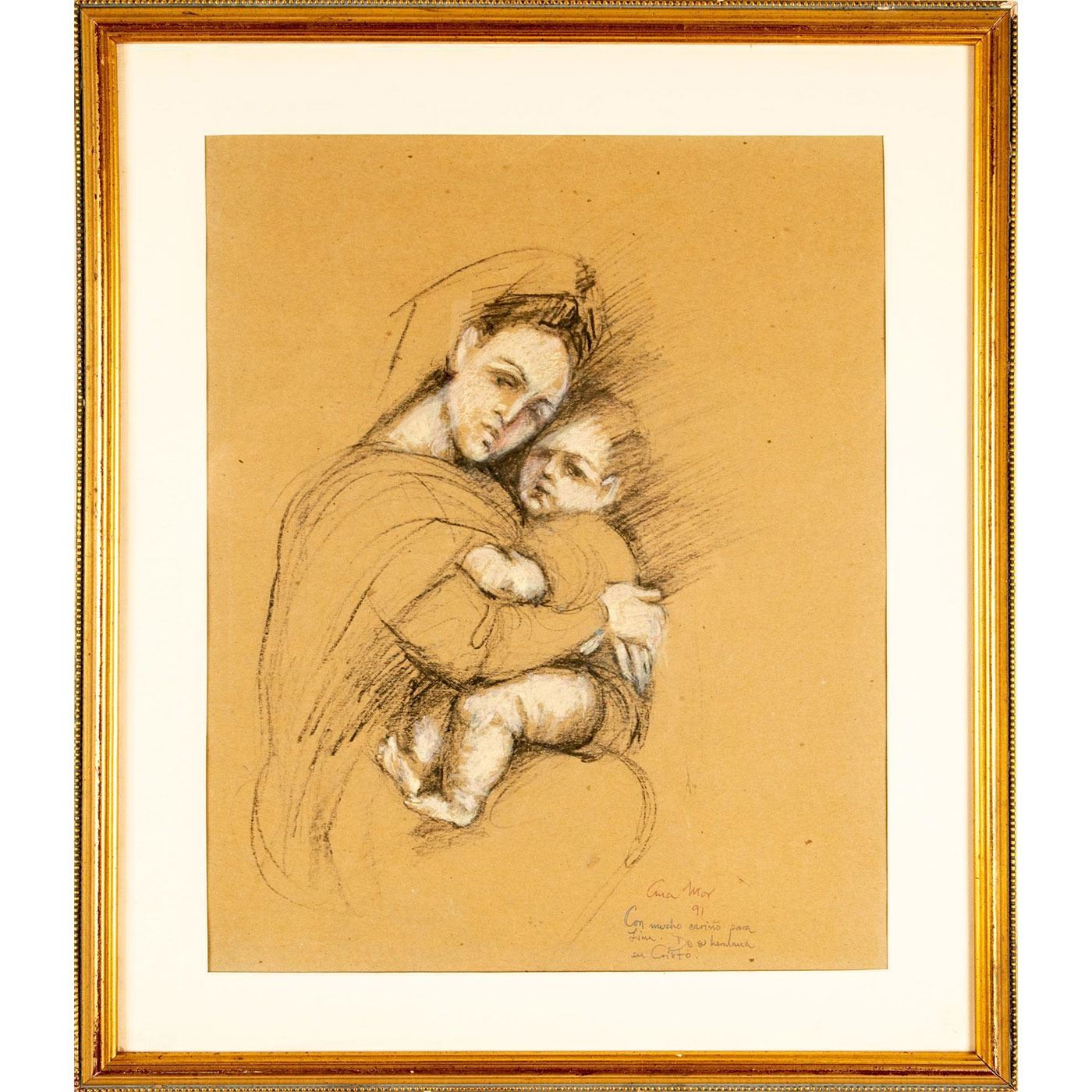 Depicts a mother and child embracing. Dedication in Spanish on paper. Signed and dated 91, lower right. Housed in gilded frame. Sight size: 19.5"H x 15.5"W. Frame: 25.5"H x 21.5"W. #art #charcoal