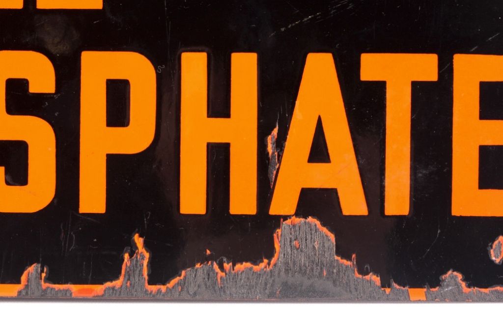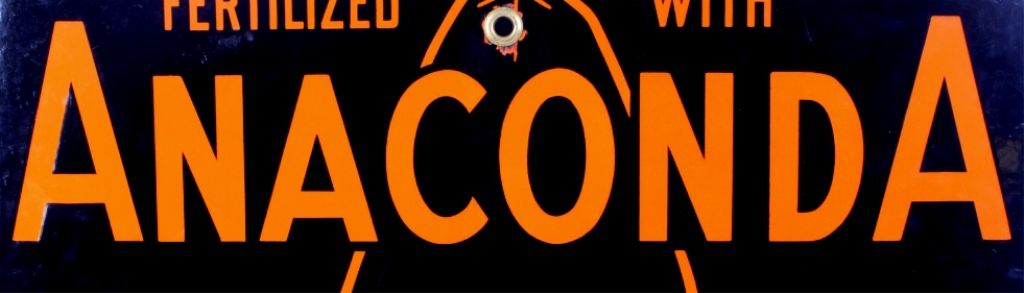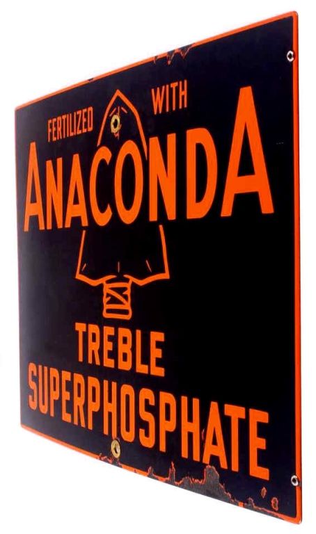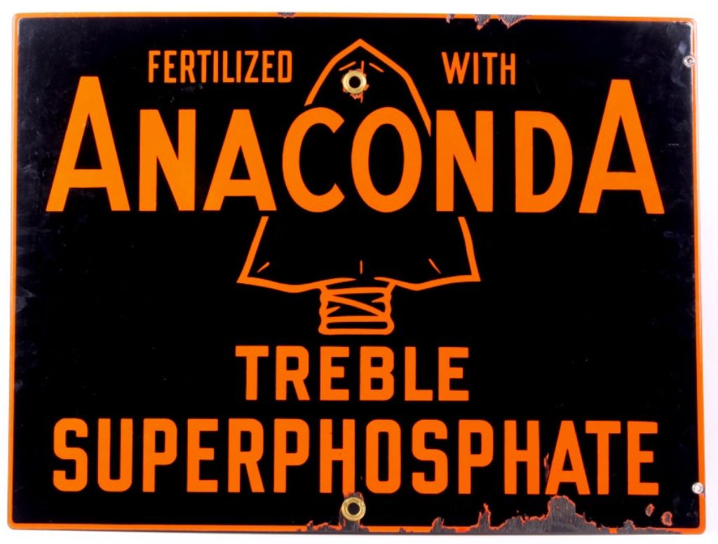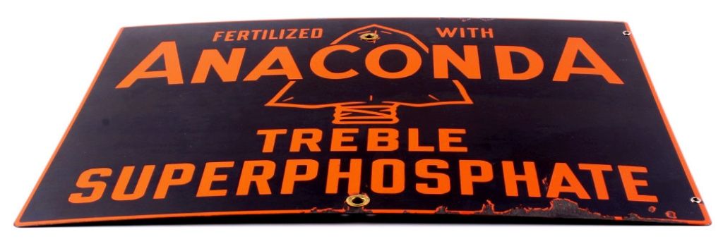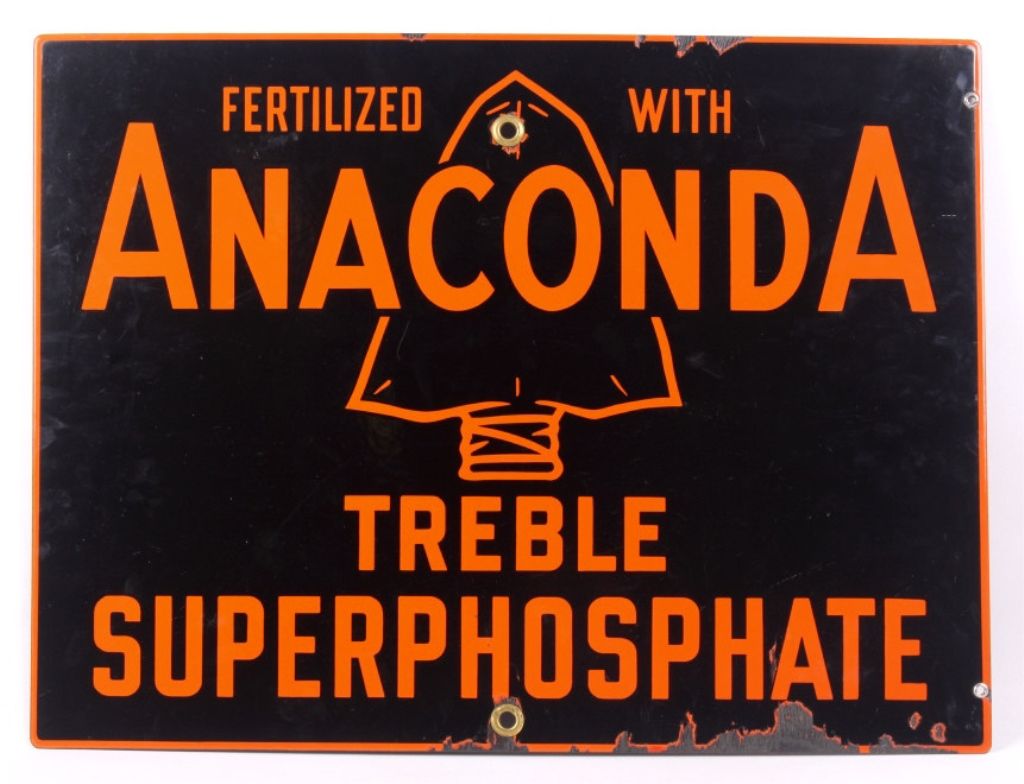 The lot features a circa 1920's original porcelain enamel Anaconda, Montana Advertising sign. The sign reads, "Fertilized with Anaconda Treble Superphosphate." Overall the sign is in great condition with asome loss to the porcelain across the bottom and minimal at the top. This rare Montana sign measures 18.5"x24.75"