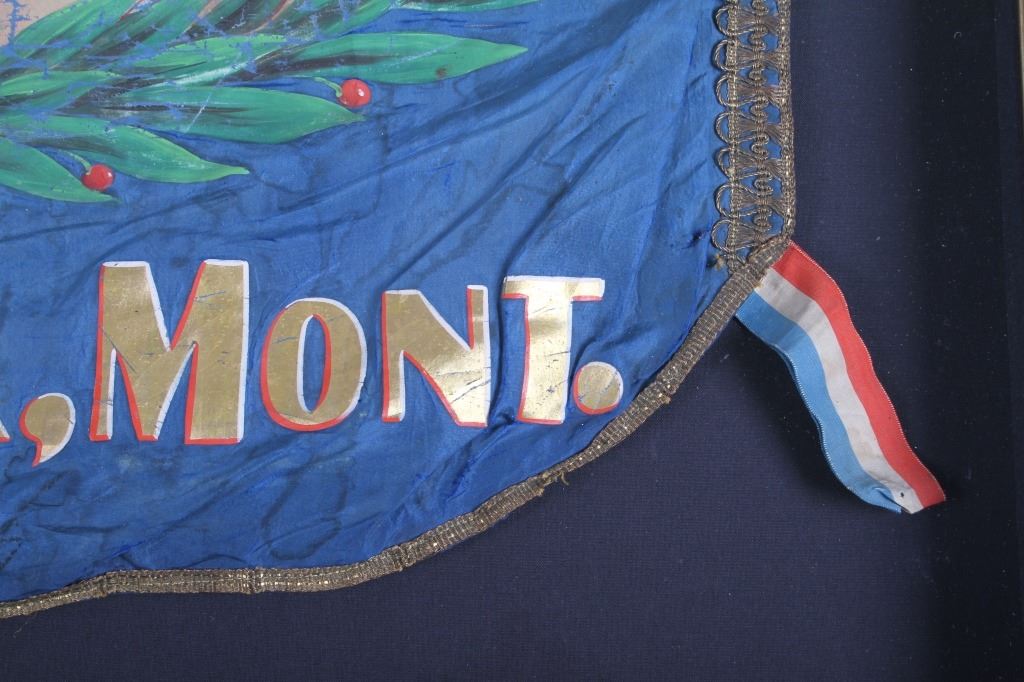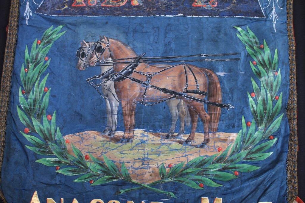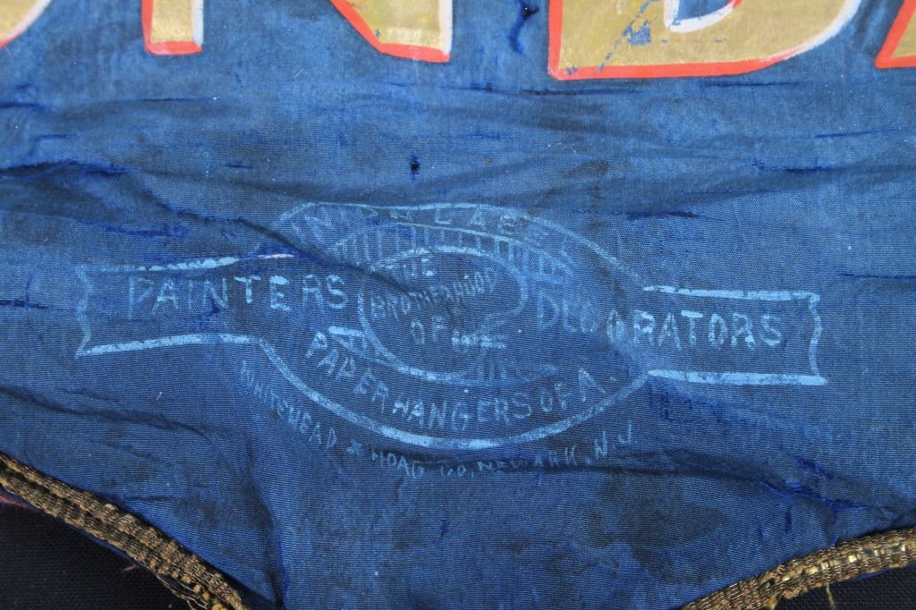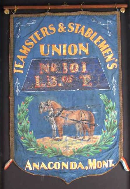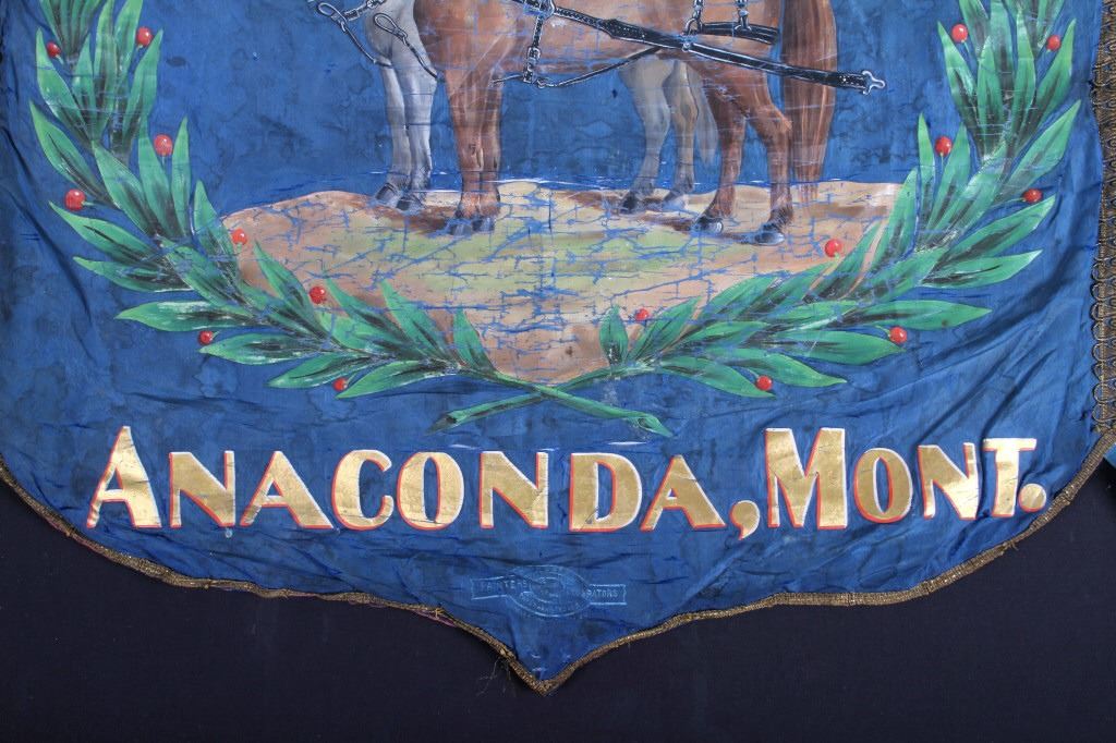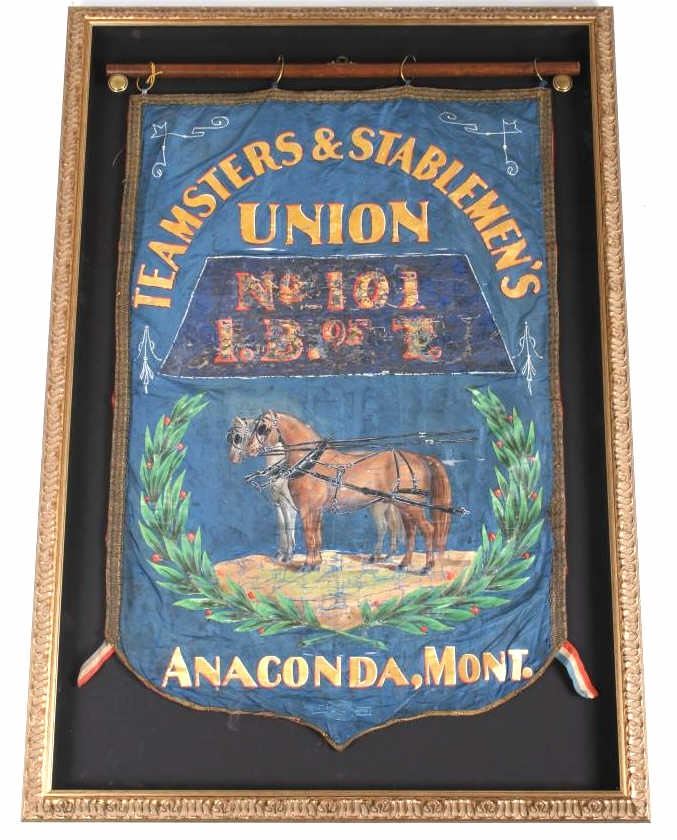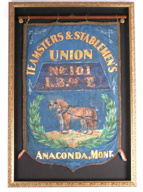 This is an exceptional important and early original Anaconda, Montana Teamsters & Stablemen's No. 101 I.B. OF T. large advertising banner. The piece is made by the iconic Whitehead & Hoag. The banner shows actual solid gold thread fancy border with gilt painted lettering and a wonderful scene of a two horse team framed in a half wreath. The piece is from the International Brotherhood of Teamsters Anaconda, Montana No. 101 Stablemen's and is the only known banner still available. Professionally framed at the expense of $1,500 with acid backing and archival glass. This is one of the finest Montana history banners available for purchase. The banner itself appears to measure 28.5"x46". The frame is 36.75"x53.25". Gold not tested.