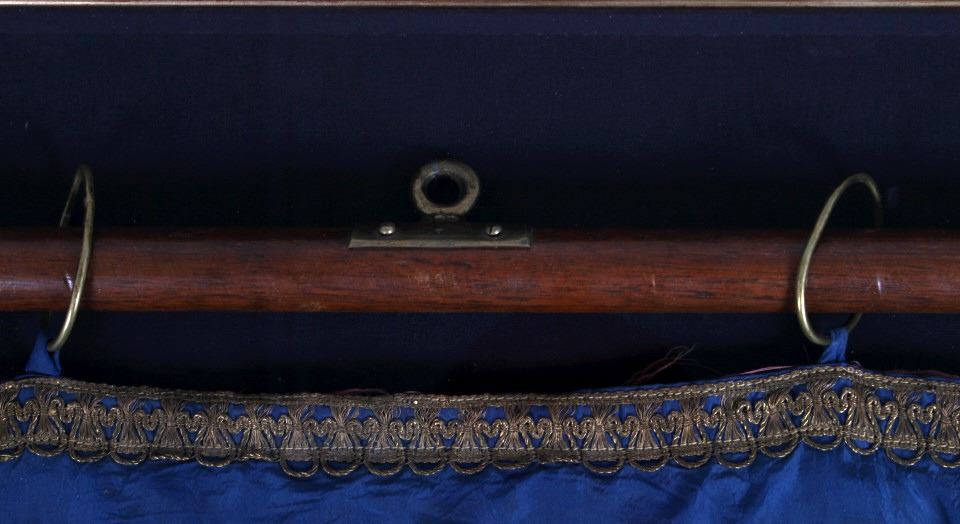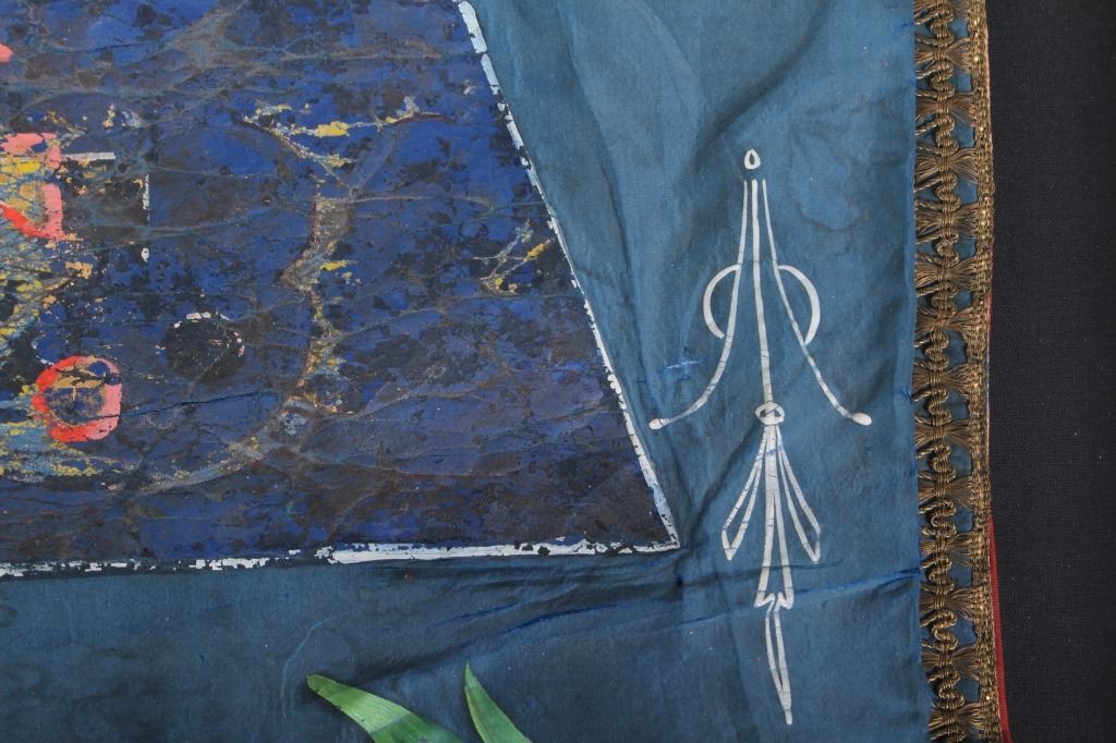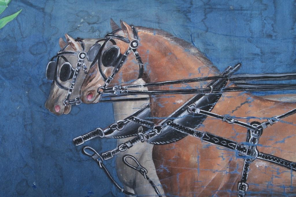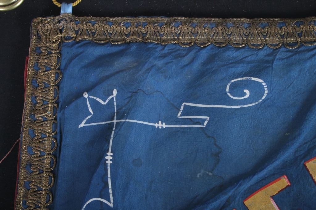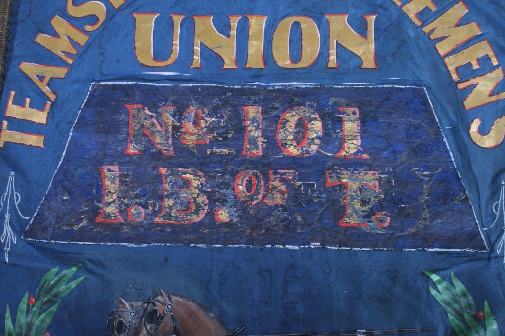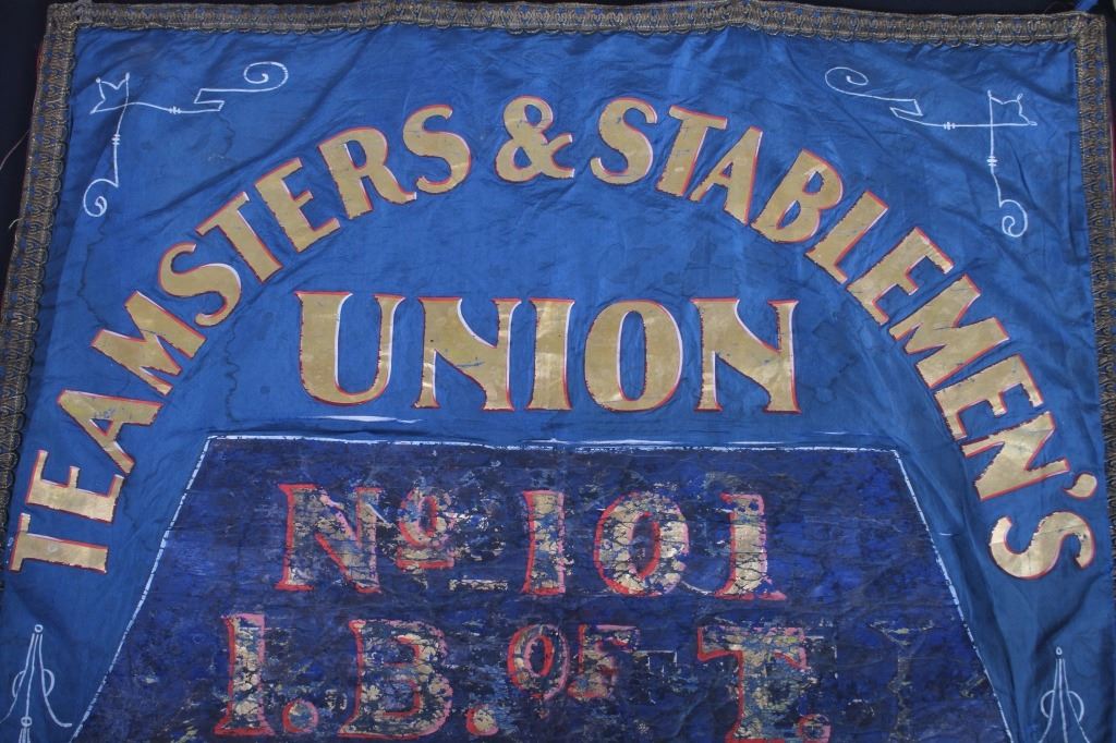 This is an exceptional important and early original Anaconda, Montana Teamsters & Stablemen's No. 101 I.B. OF T. large advertising banner. The piece is made by the iconic Whitehead & Hoag. The banner shows actual solid gold thread fancy border with gilt painted lettering and a wonderful scene of a two horse team framed in a half wreath. The piece is from the International Brotherhood of Teamsters Anaconda, Montana No. 101 Stablemen's and is the only known banner still available. Professionally framed at the expense of $1,500 with acid backing and archival glass. This is one of the finest Montana history banners available for purchase. The banner itself appears to measure 28.5"x46". The frame is 36.75"x53.25". Gold not tested.