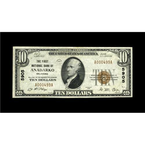 <B>Anadarko, OK</B></I> - $10 1929 Ty. 1 <B>The First NB</B></I> Ch. # 5905<BR>This was the only bank chartered in this small Caddo County community which lasted long enough to issue Series 1929 examples, and it's no surprise that a collection of this magnitude would contain one of the two finest specimens listed in the census. <B>Extremely Fine.</B></I><BR><BR><b>Shipping:</b> Coin/Currency (<a target="_blank" href="http://www.heritageauctions.com/common/shipping.php">view shipping information</a>)