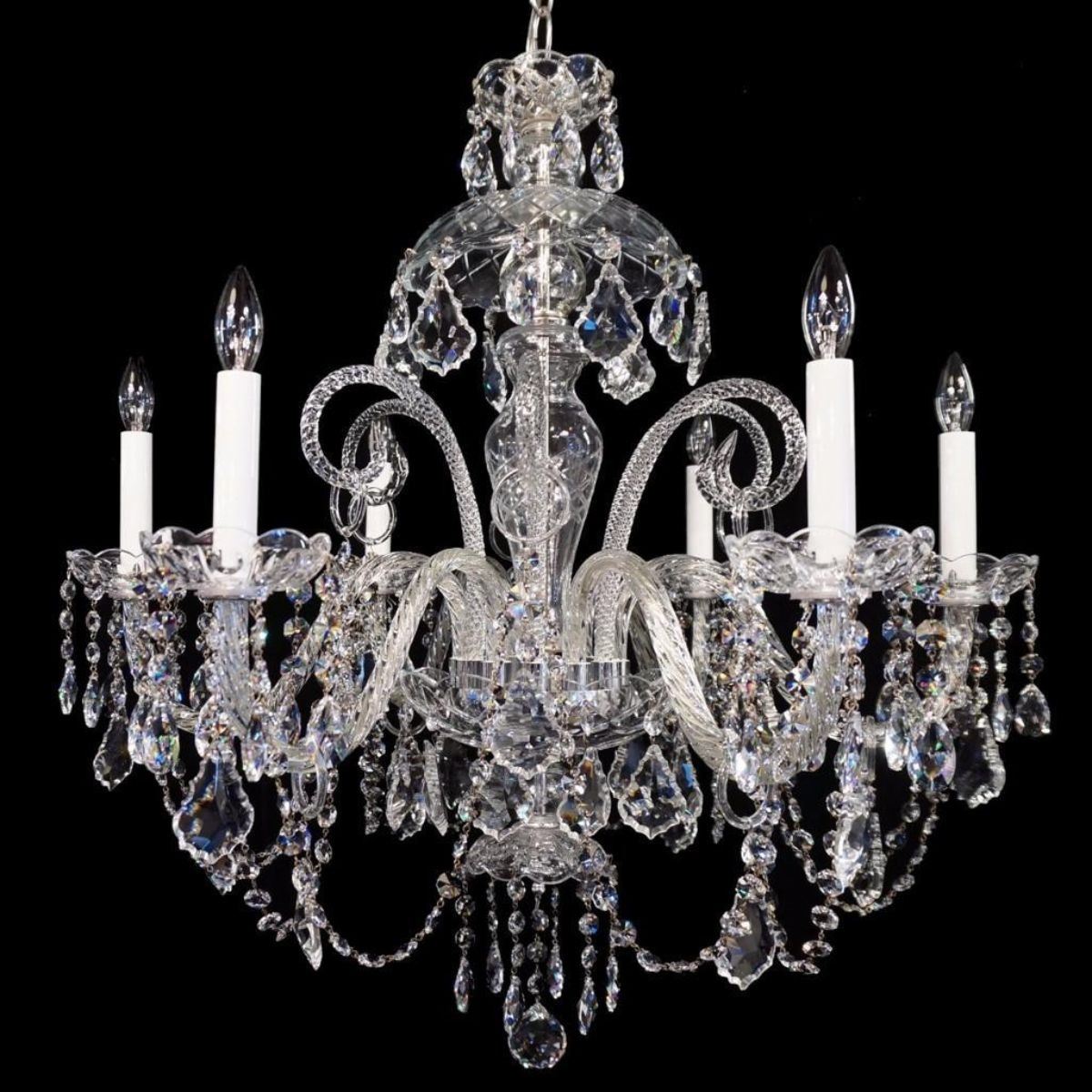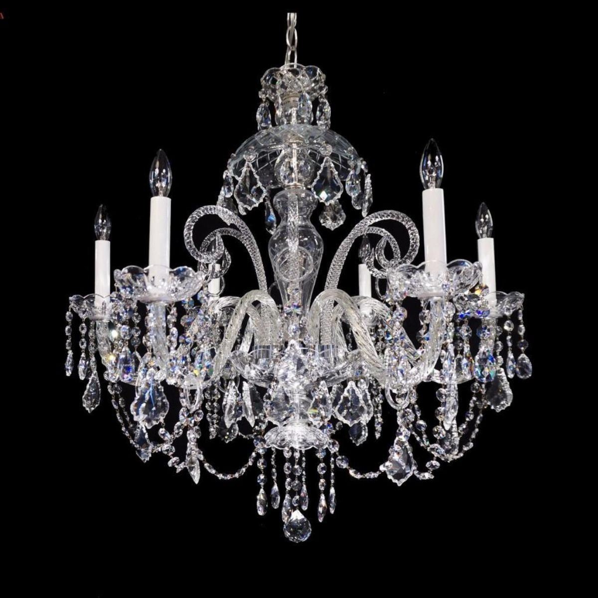 Anadel with your choice of Swarovski Crystal Make sure to look close to catch the lovely crystal detail of the Anadel chandelier. The over-sized bobeches on the top and on the bottom balance this shorter crystal chandelier. The leaf shaped pendalogues used as accents on the arms, scrolls, top and bottom give this chandelier a slight French styling that looks classic in any decor. The Signature 3-button almonds dress the smaller bobeches. Add this lovely chandelier to your dining room or your living room for a sophisticated, yet charismatic, focal point. Quick Look: 26" wide x 28" long 6 lights Candelabra base, 40 watt max per socket. Chain and mounting hardware included. Assembled in US of imported and domestic components. UL Dry Location Shown in Polished Nickel 30 lbs
