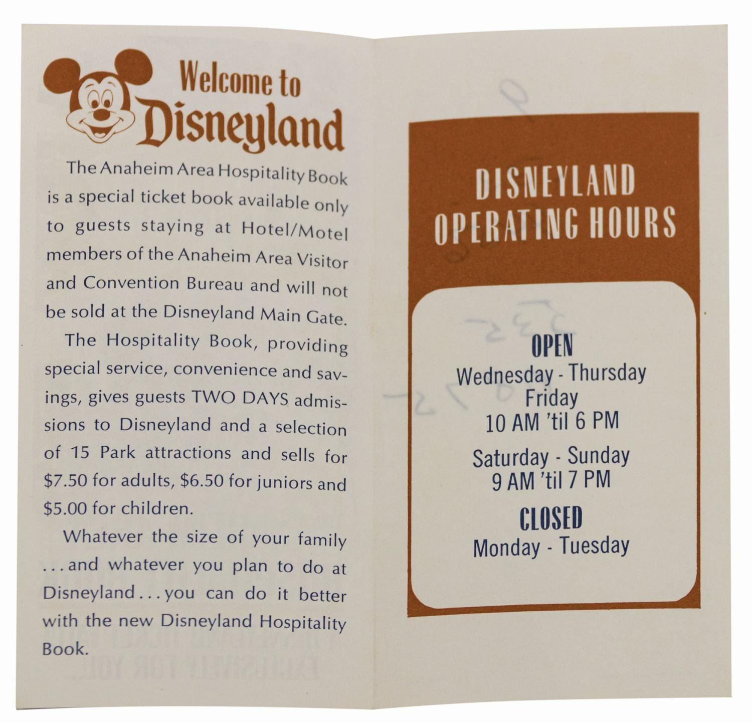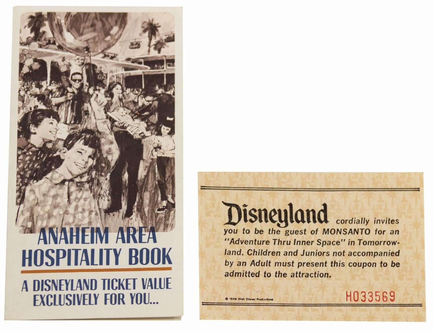 (Disneyland, 1968) An advertising brochure for the Disneyland Anaheim Area Hospitality Book discount ticket offer. The Hospitality Book was an exclusive ticket book providing 2 days park admission and 15 ride tickets at a reduced rate. The bi-folded brochure is accompanied by a special Disneyland ride ticket for Adventure Thru Inner Space courtesy of sponsor Monsanto. The brochure measures 5.5"x2.75" and the ticket is 2.5"x3.5". Both remain in very good condition. The brochure exhibits some faint creasing and phone numbers written in pen on the back page. The ticket has a faint vertical crease.