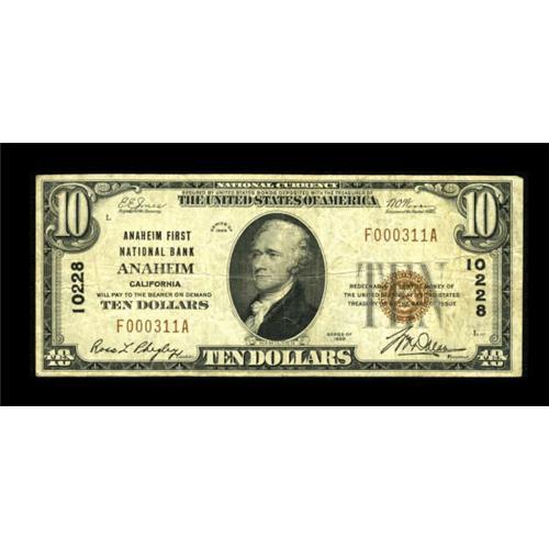 <B>Anaheim, CA</B></I> - $10 1929 Ty. 1 <B>Anaheim First NB</B></I> Ch. # 10228<BR> This <B>Very Good+</B></I> example bears the second title for the bank<B>.</B></I><BR><I>From The Kansas City Collection.</B></I><BR><BR><b>Shipping:</b> Coins & Currency (<a target="_blank" href="http://www.heritageauctions.com/common/shipping.php">view shipping information</a>)