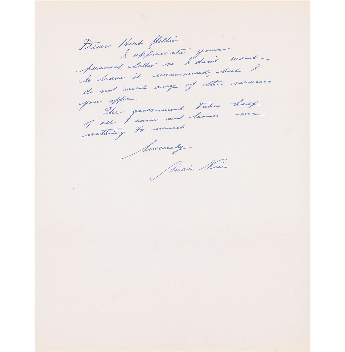 Modernist writer (1903–1977) whose sexually explicit journals and correspondence with Henry Miller led to her popular resurgence in the 1970s as a feminist icon and a literary figure of the avant-garde. ALS, one page, 8.5 x 11, no date. Letter to Herb Yellin, in full: “I appreciate your personal letter so I don’t want to leave it unanswered, but I do not need any of the services you offer. The government takes half of all I earn and leaves me nothing to invest.” In fine condition. From the collection of noted publisher and founder of Lord John Press, Herb Yellin.