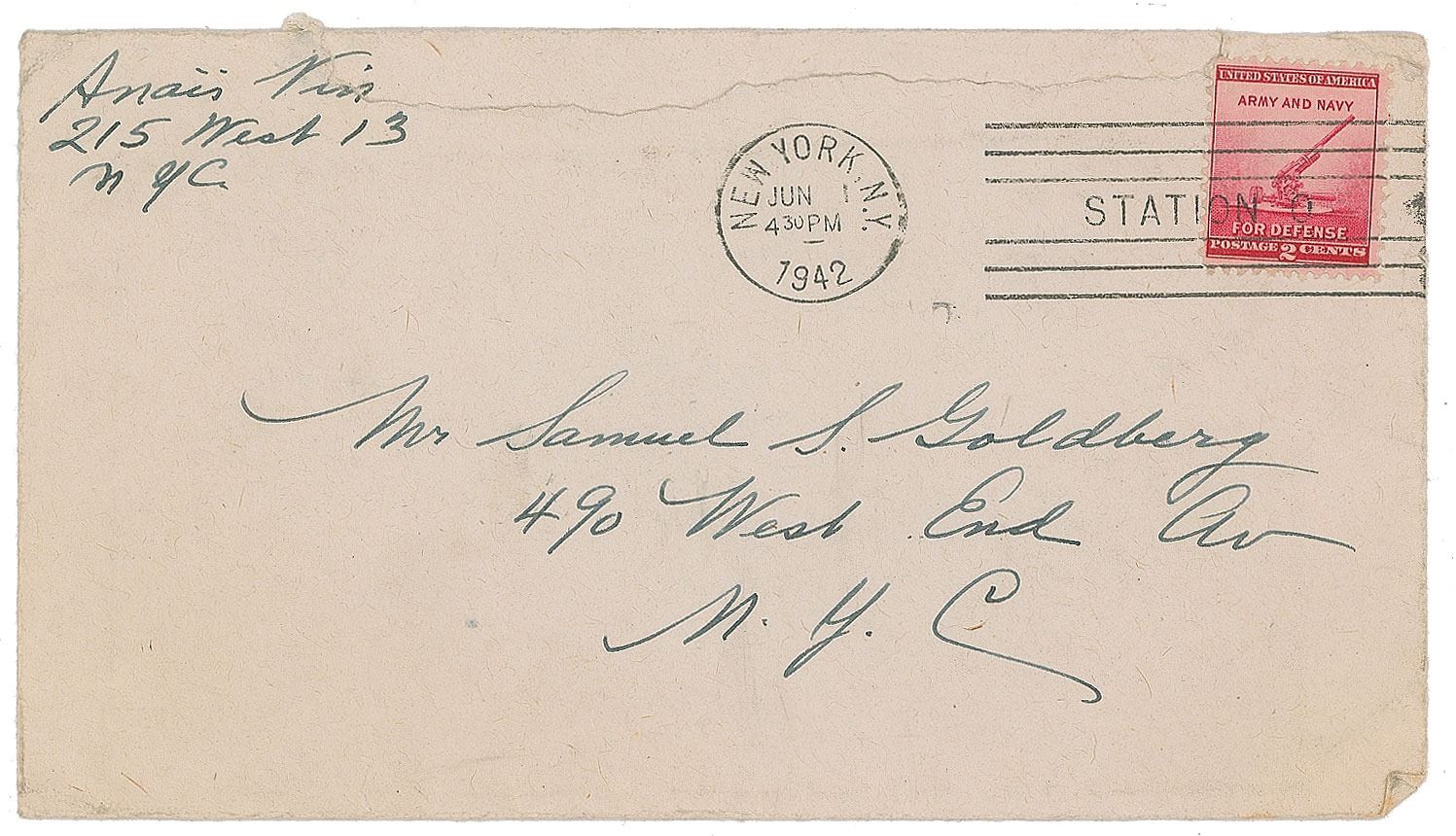 Modernist writer (1903–1977) whose sexually explicit journals and correspondence with Henry Miller led to her popular resurgence in the 1970s as a feminist icon and a literary figure of the avant-garde. ALS signed “Anais,” seven pages two sets of adjoining sheets, 5 x 6.5, postmarked June 1, 1942. Letter to Samuel S. Goldberg, in full: "I wanted you to know the intimate truth underlying the question of the Press as you know the truth about all my life. It is a deeper issue at stake than appears on the surface, a question of liberation and conquering a problem which has consumed the greater part of my energy wastefully,—the until now unmastered art of facing reality and the perpetually harassing economic problem—As my analyst said today: if this happens I am free to do greater things. And who knows but what our freedoms are linked and may interact on one another? Anyway—it’s a grave turning point—either I ascend from the dreamer’s utter incapacity to cope with simple reality—and free myself and conquer with a push from you—or I fail and continue to fritter away my energy as other writers did in the past and present on the daily battle. This is a battle you have won because you have a sense of reality in this realm. Perhaps I may help you to win your battle with your dreams, about which I know a great deal. Sam, this is no trivial matter, but a turning point and for me a deep liberation. I hope it will come from you primarily because I feel you understand my life and my work and are participating in it. I want you to be conscious of the change in me and to have confidence in me. The first Press, as it was done was a dream, and not soundly constructed. Even though I produced 2 beautiful books, as it was, it could not survive. But meanwhile as you know, I awakened. Do you see what I mean? Since then, you must believe me, since the day you laughed at my price quotations, I have learned about machines, about prices, about the necessity of a commercial basis so that the dreams can take shape. Let it be you who will create this as well as use it, if it frees me of stifling burdens and opens a road surely it must bring much back to you. You know, Sam, that among the givers, of which I have been one, and you another, what is given is always a fecund exchange. The takers do not know of this—They take. But in our case I feel that what you do for me will be for you too because I am aware and conscious of its meaning. This push I gave others when I was able to, I believe now I know how to use it for its very best." In fine condition. Accompanied by the original mailing envelope addressed in her own hand, incorporating her signature in the return address area.