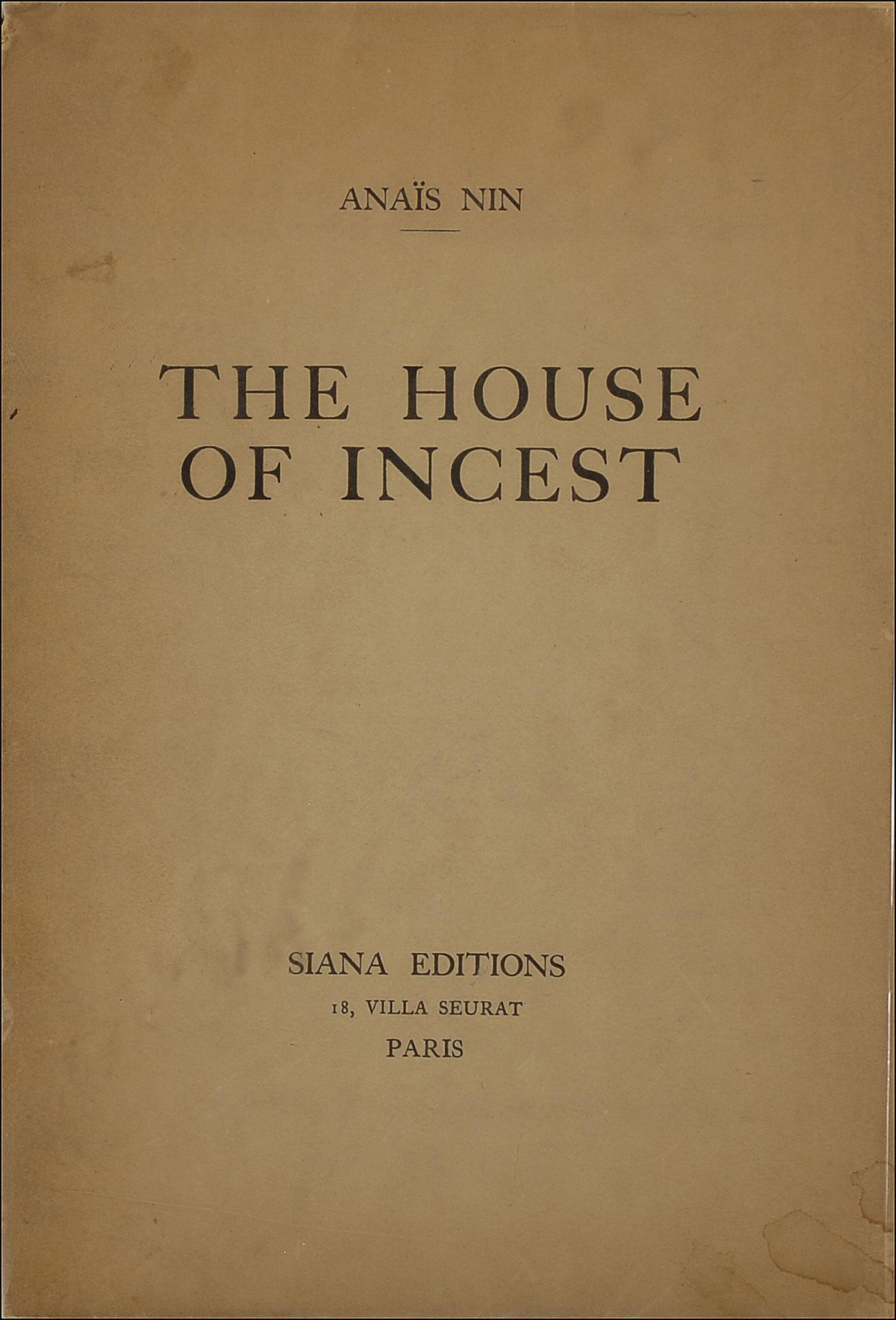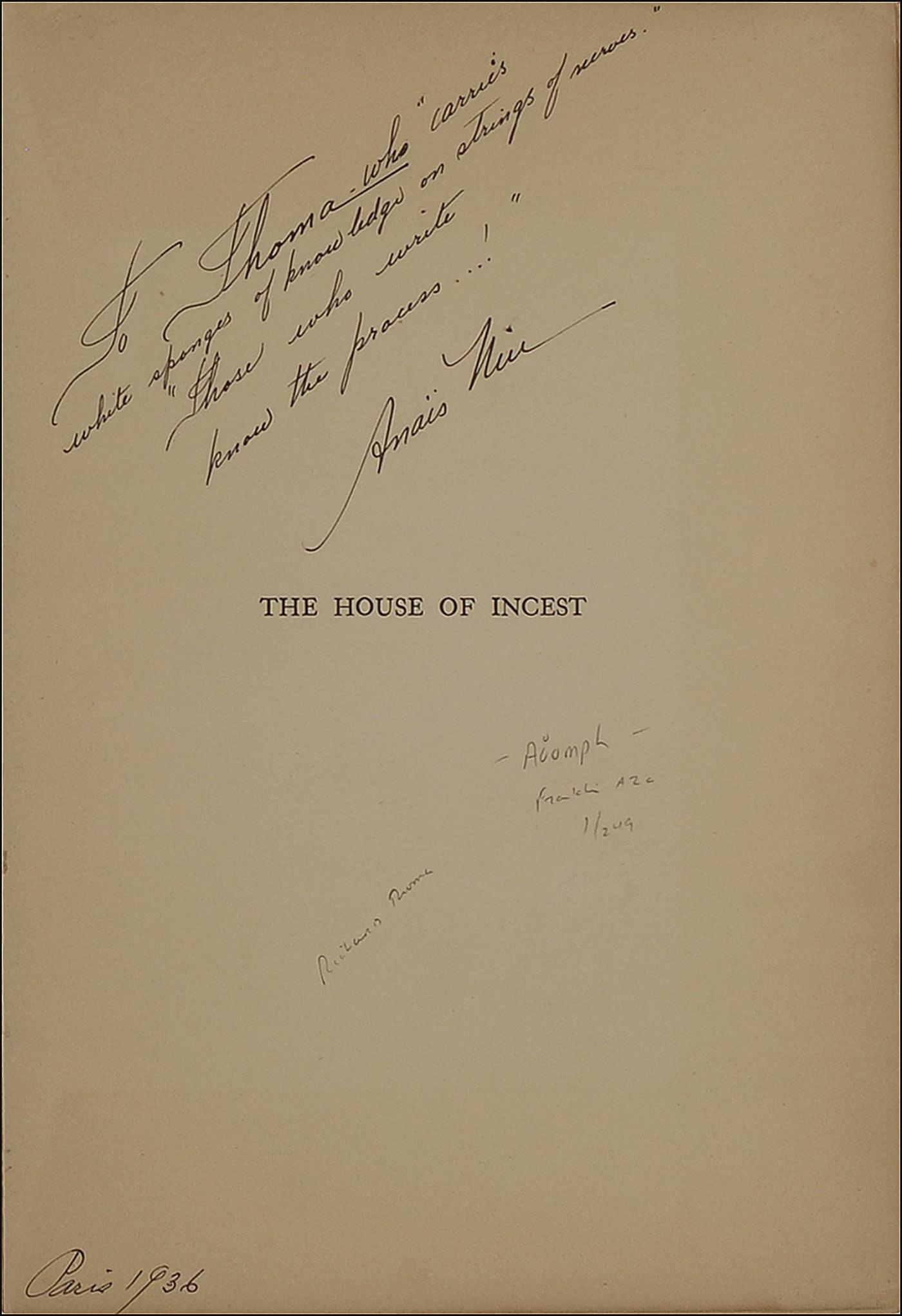 Modernist writer of short stories and novels. Her sexually explicit journals and correspondence with Henry Miller led to her popular resurgence in the 1970s as a feminist icon and a literary figure of the avant-garde. Signed book: The House of Incest. Limited first edition of 249 copies (this being No. 73). Paris: Siana Editions, 1936. Softcover, 7.5 x 11, 89 pages. Signed and inscribed on the half-title page, “To Thomas - who carries white sponges of knowledge on strings of nerves. Those who write know the process…! Anais Nin Paris, 1936.” On the preceding page, inexplicably, Nin has also written, “To Richard.” In very good condition, with chipping and paper loss along the partially detached and fragile spine and binding, first free end page detached but present, mild toning to pages and covers, several pencil notations to signed page, and some scattered light toning and staining to cover. An important work as this was the the second book published by Nin. Accompanied by an unsigned hardcover limited edition of her book entitled D. H. Lawrence, An Unprofessional Study, her first book published in 1932. RRAuction COA.