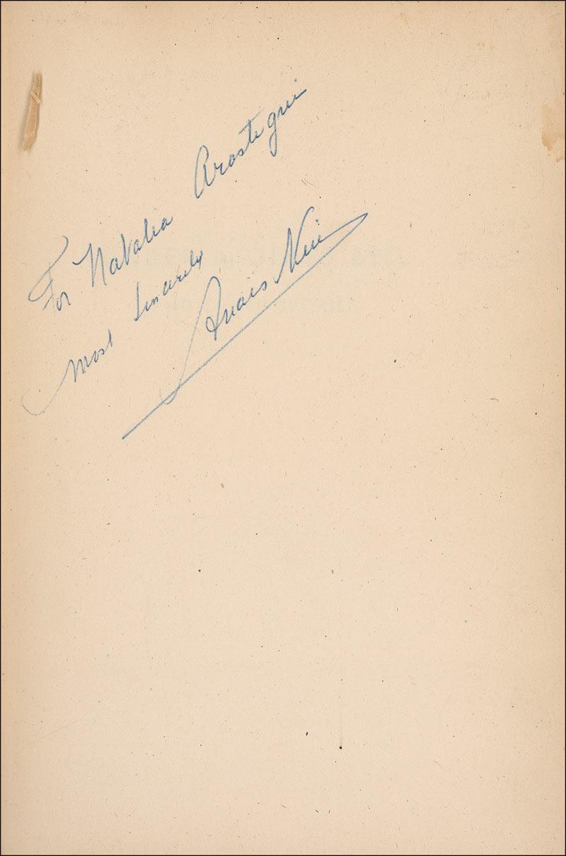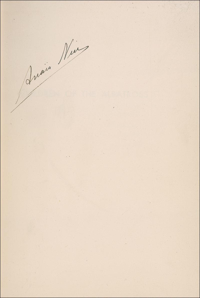 Modernist writer of short stories and novels. Her sexually explicit journals and correspondence with Henry Miller led to her popular resurgence in the 1970s as a feminist icon and a literary figure of the avant-garde. Two hardcover books: a first edition of Under a Glass Bell, signed and inscribed on the first free end page, “For Natalia Arostegui, most sincerely, Anais Nin”; and a first edition of Children of the Albatross, signed on the first free end page by Nin. Glass Bell rates in very good condition, with uniform toning to signed page and inside pages, light soiling to last page and back pastedown, and some light wear to covers. The dustjacket is lightly toned and worn, with some light soiling and edge chipping. Albatross rates fine, with small separation to front hinge, and some light wear, toning, and soiling to dustjacket. RRAuction COA.