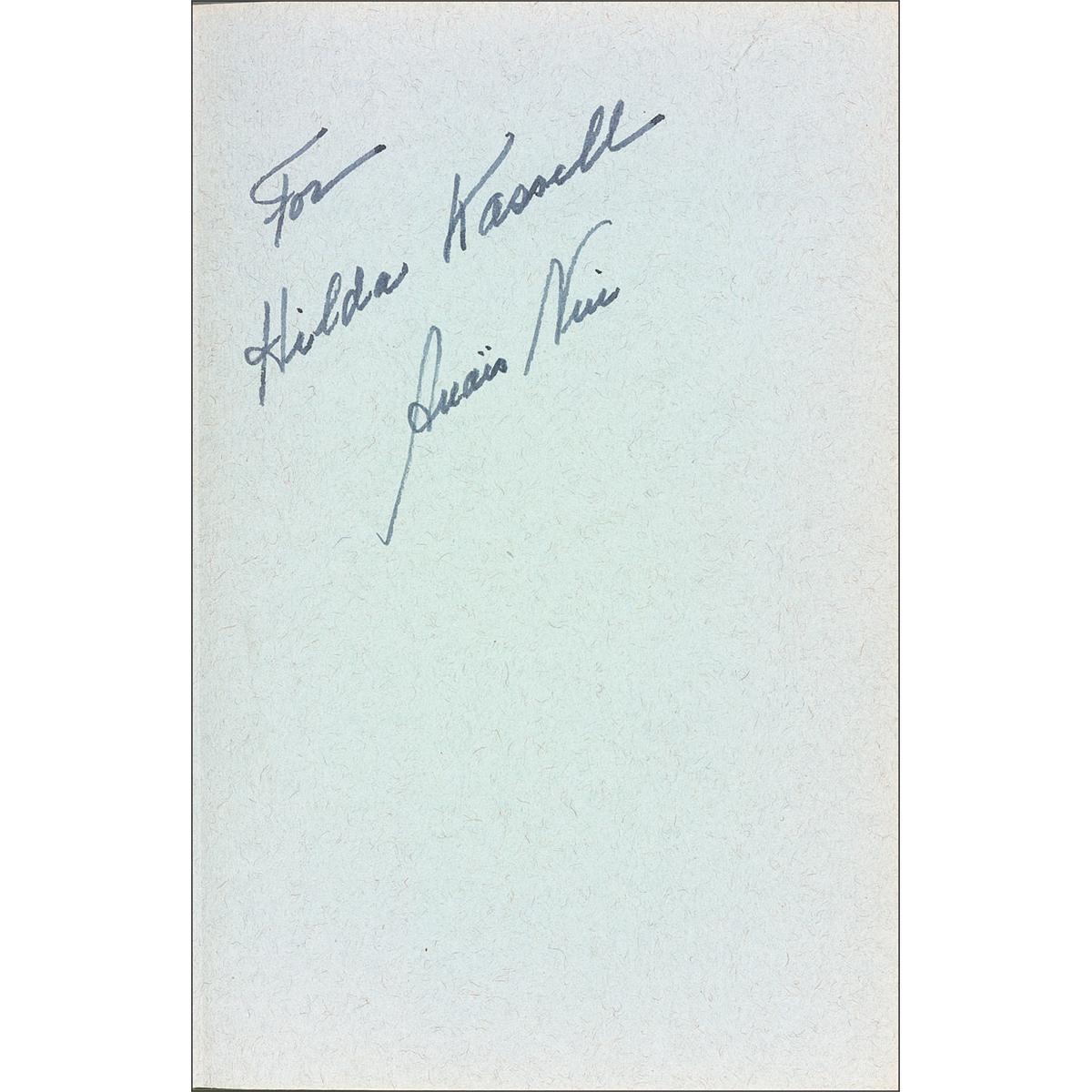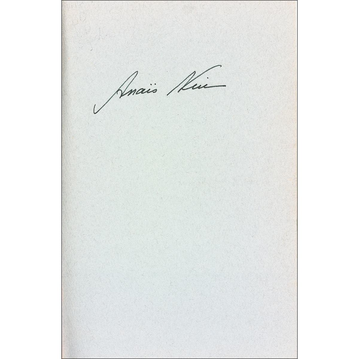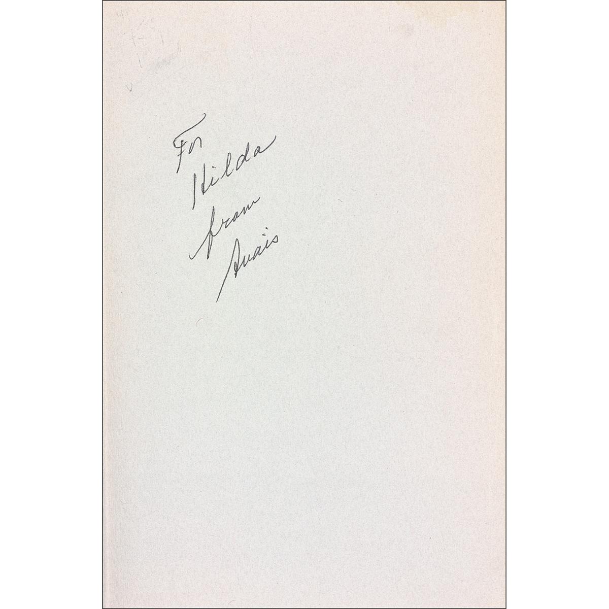 Modernist writer of short stories and novels. Her sexually explicit journals and correspondence with Henry Miller led to her popular resurgence in the 1970s as a feminist icon and a literary figure of the avant-garde. Four hardcover books: a first edition of The Diary of Anais Nin, Volume Two, signed and inscribed on the first free end page, “For Hilda Kassell, Anais Nin”; a first edition of The Diary of Anais Nin, Volume Three, signed the first free end page by Nin; a first edition copy of The Diary of Anais Nin, Volume Four, signed and inscribed on the first free end page, “For Hilda from Anais”; and a first edition copy of the Anais Nin Reader, signed on a bookplate affixed to the first free end page. In overall very good condition, with light wear to the dustjackets.