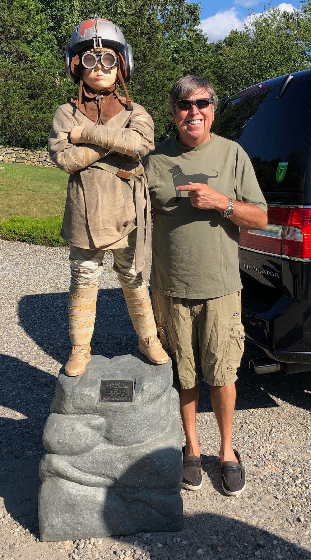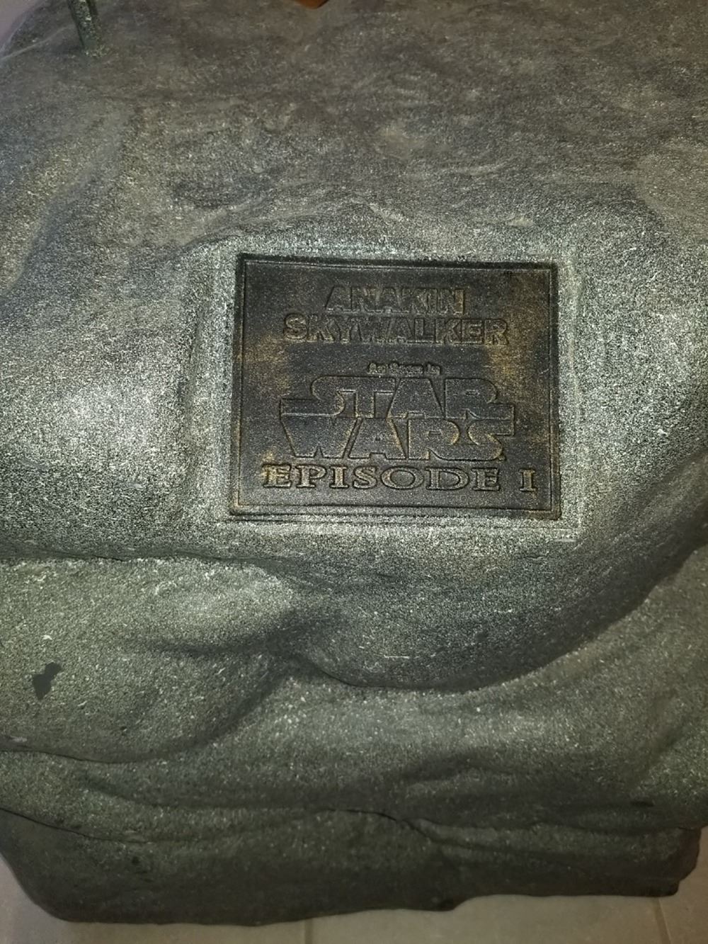 Life Size Anakin Skywalker figure made for JCPenney, c. 1999. This item was used in JCPenney stores to promote Star Wars Episode I. A limited number of these statues were produced for JCPenney and raffled off. The Anakin mannequin is approximately 55.5" tall. Anakin stands on top of a 23.5" replica rock base, measuring 79" tall in total. The rock base is 21" deep by 22.5" wide. Anakin can easily be removed from the base. There is a metal rod permanently attached to the base that inserts into a hole in Anakin's right foot. This statue was designed by Don Post for Lucasfilm in 1999. Anakin and the base are made of fiberglass. The clothing is real fabric similar to what is seen in the movie. He has life-like hair, pod racing helmet with fold-up goggles. The helmet is not removable. The base has plaque that says "Anakin Skywalker Star Wars Episode I." It is a very accurate representation of young Anakin ready for his pod race.