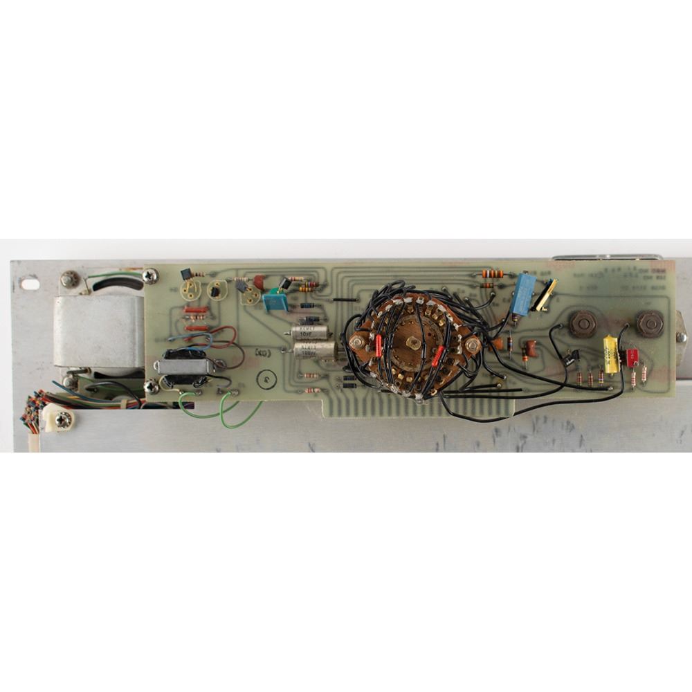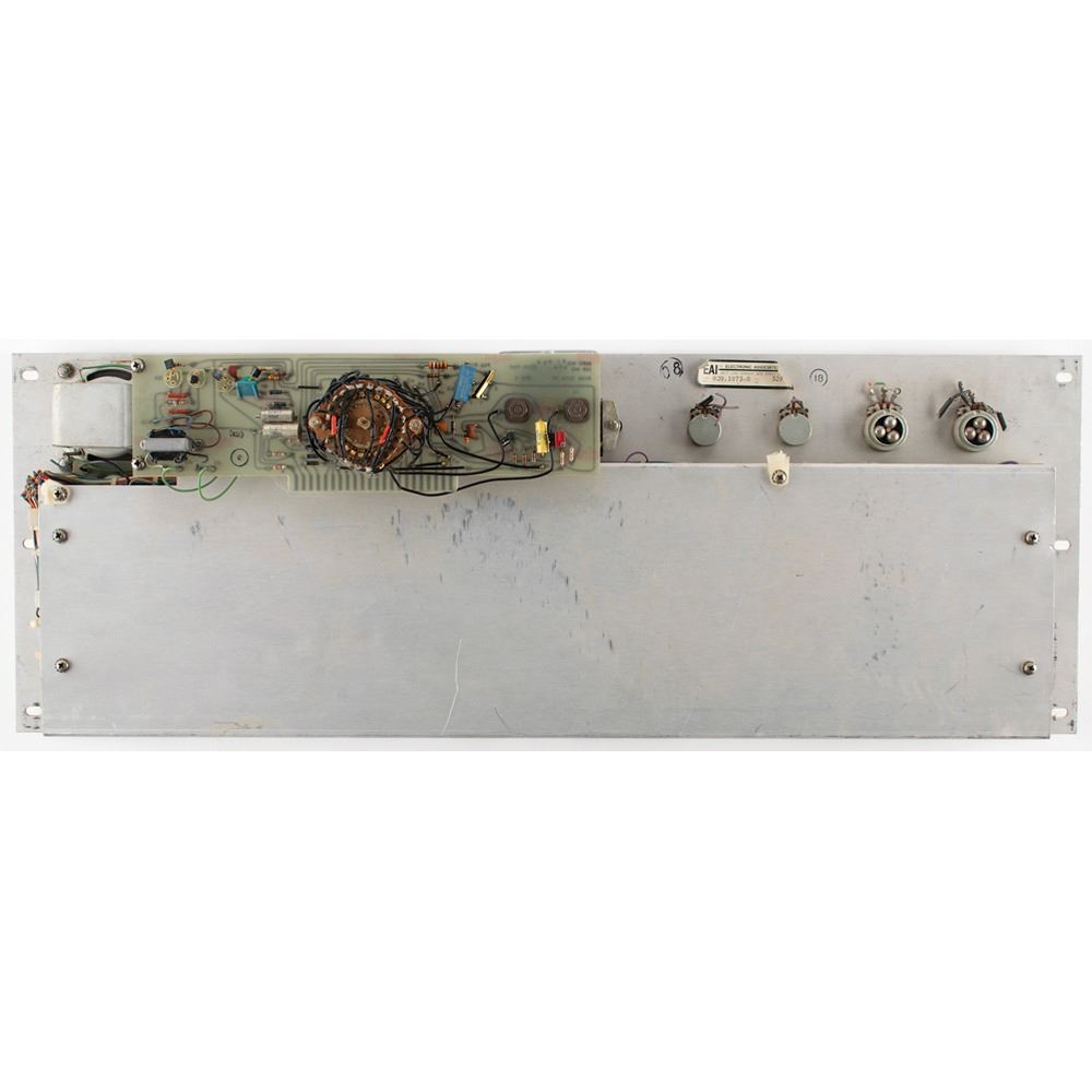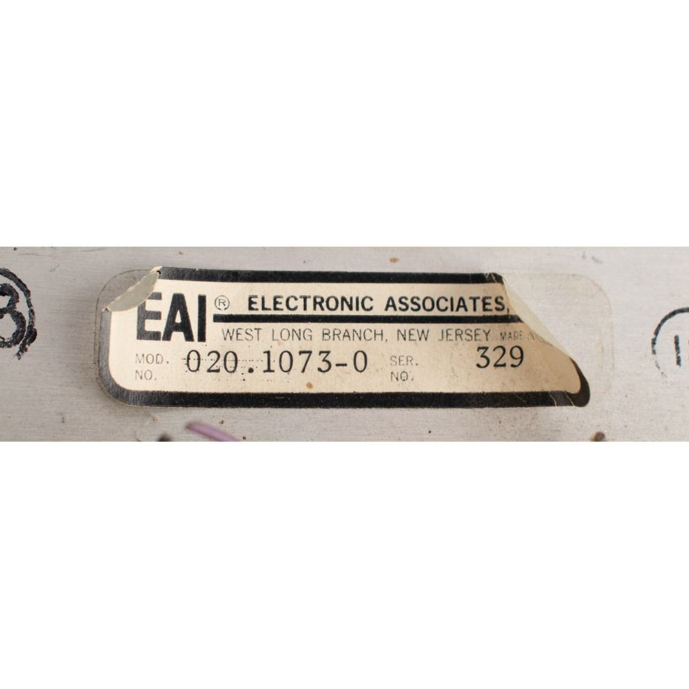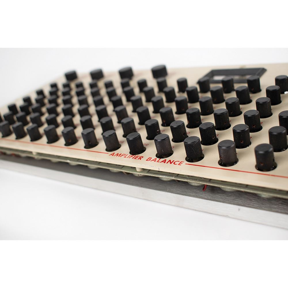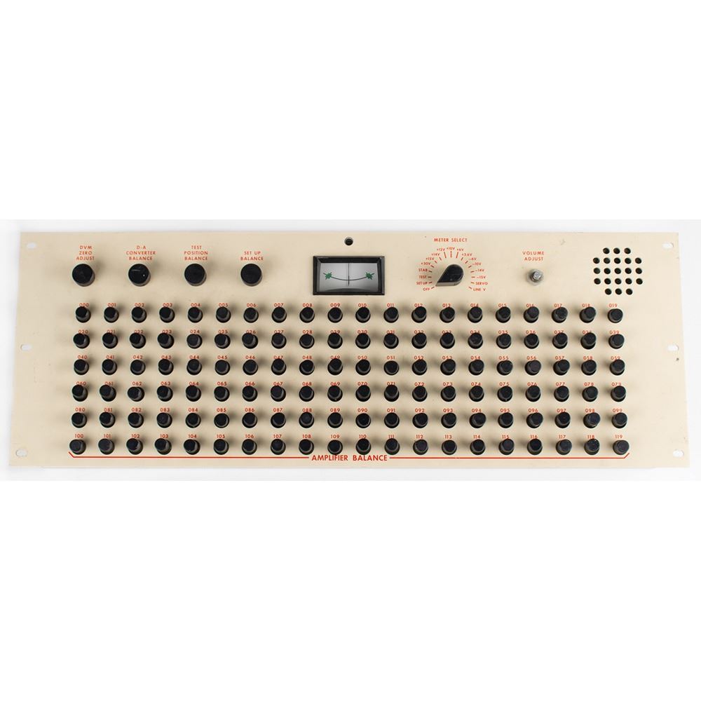 Vintage rack-mount analog computer control panel by Electronic Associates, measuring 24Àù x 8.5Àù x 3.5Àù, with the manufacturer's label applied to the reverse: "Mod. No. 020.1073-0, Ser. No. 329." The panel features a bank of 119 "Amplifier Balance" control knobs; a meter and meter selection switch; and adjustment knobs for digital voltmeter (DVM) adjustment, digital-analog converter balance, test position balance, and set up balance. In very good to fine condition.