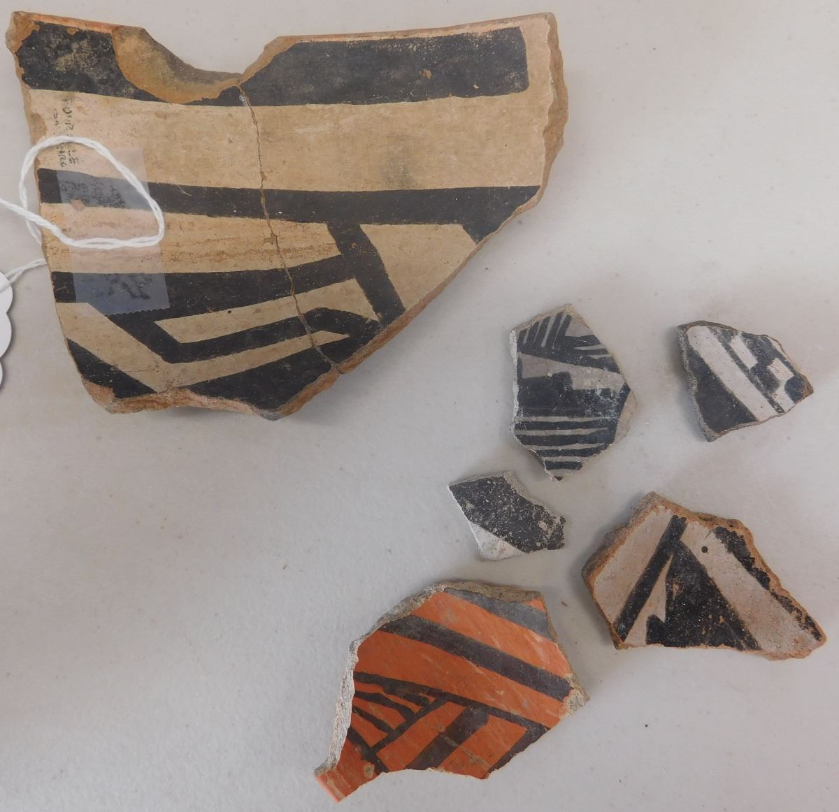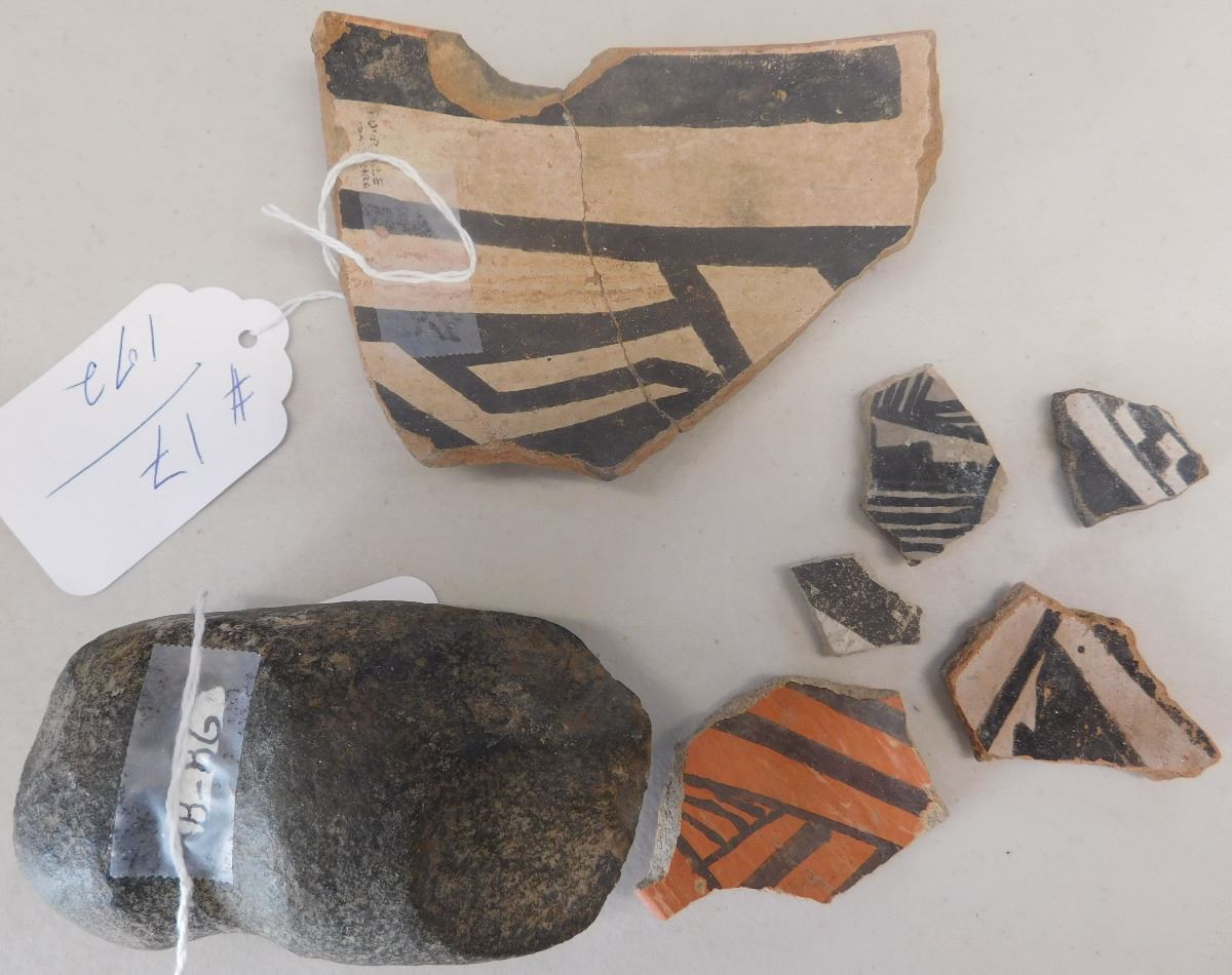 Anasazi Axe & Potshards, pre-historic items. Made of basalt stone and clay, the axe measures 4.5" x 2.5" and the pottery shards are 1" to 4". From the 4 corners area of the southwestern USA. Old museum #B-86. Condition: All items have damage, see images. Shipping: $22.00, pottery requires double box.