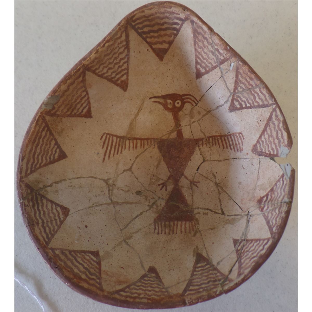 Anasazi Bird Pot circa 600 A.D. Made of clay and paint. Measures 6.5" x 6" x 2.5". Pueblo, New Mexico. Condition: Pot is probably a ladel, it was found in pieces and reglued. Shipping: $20.