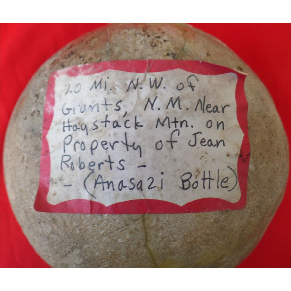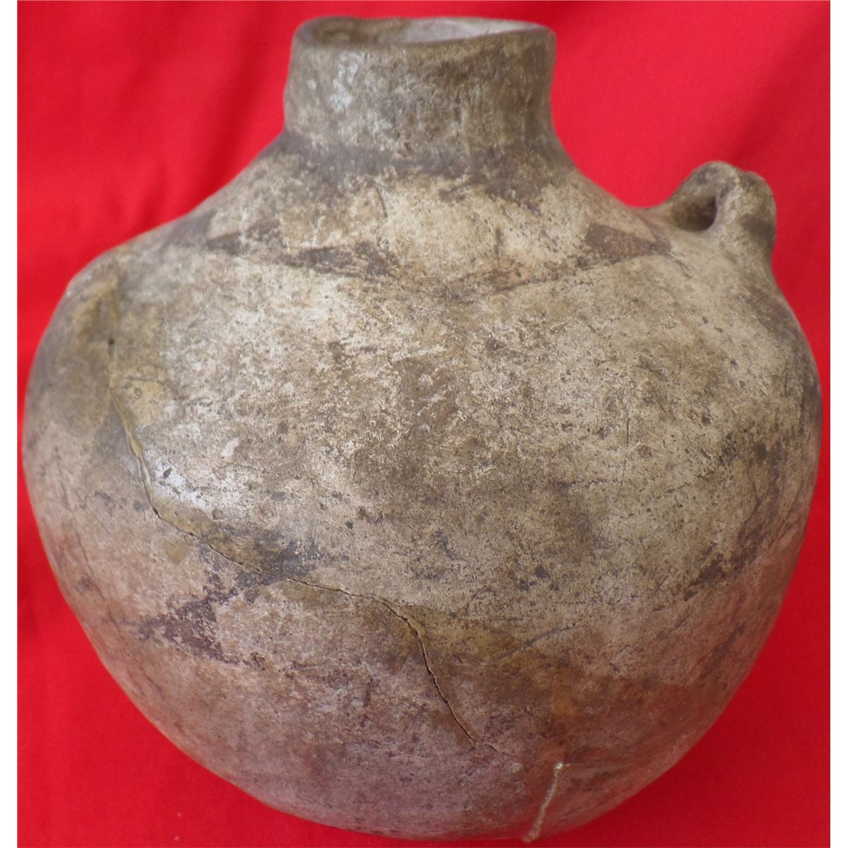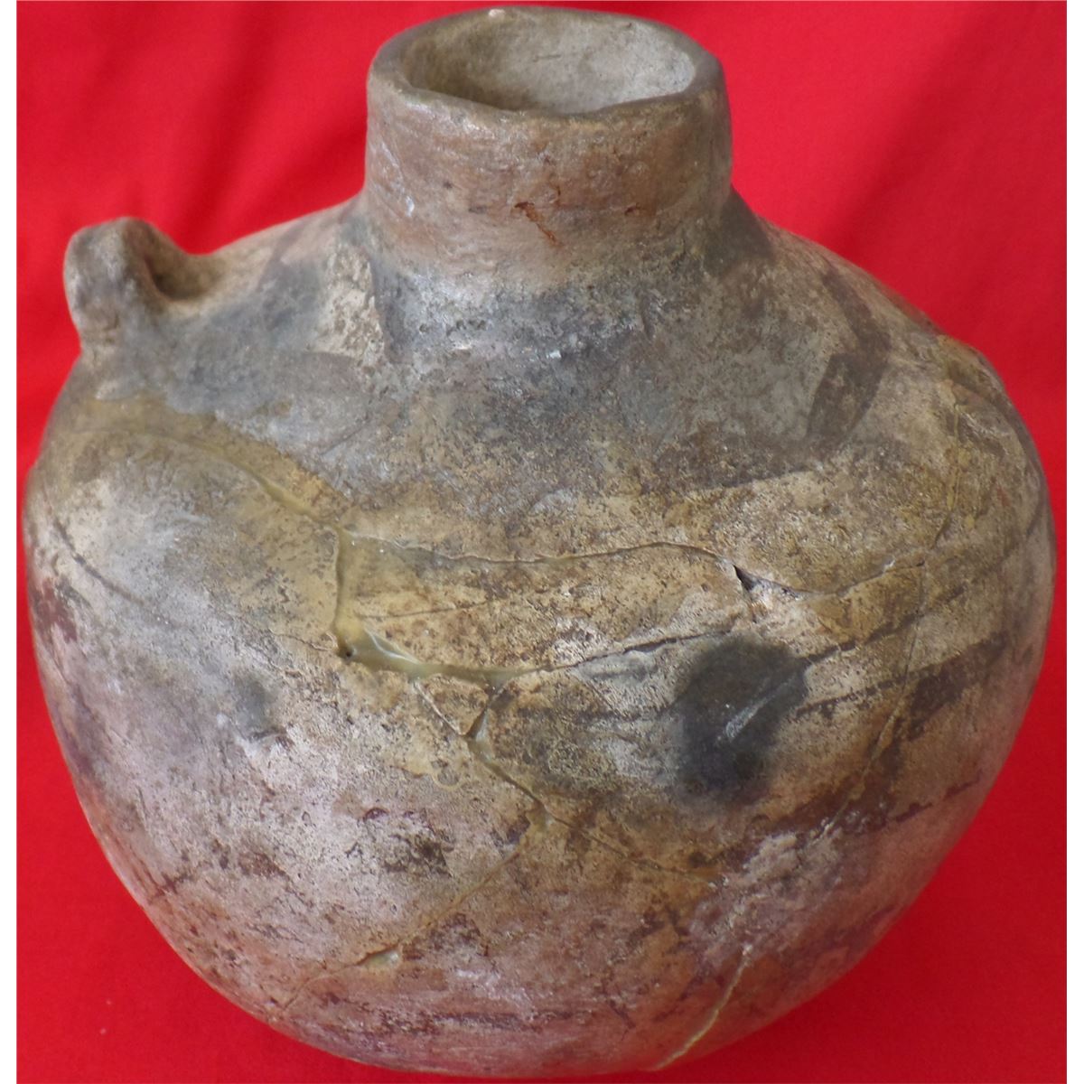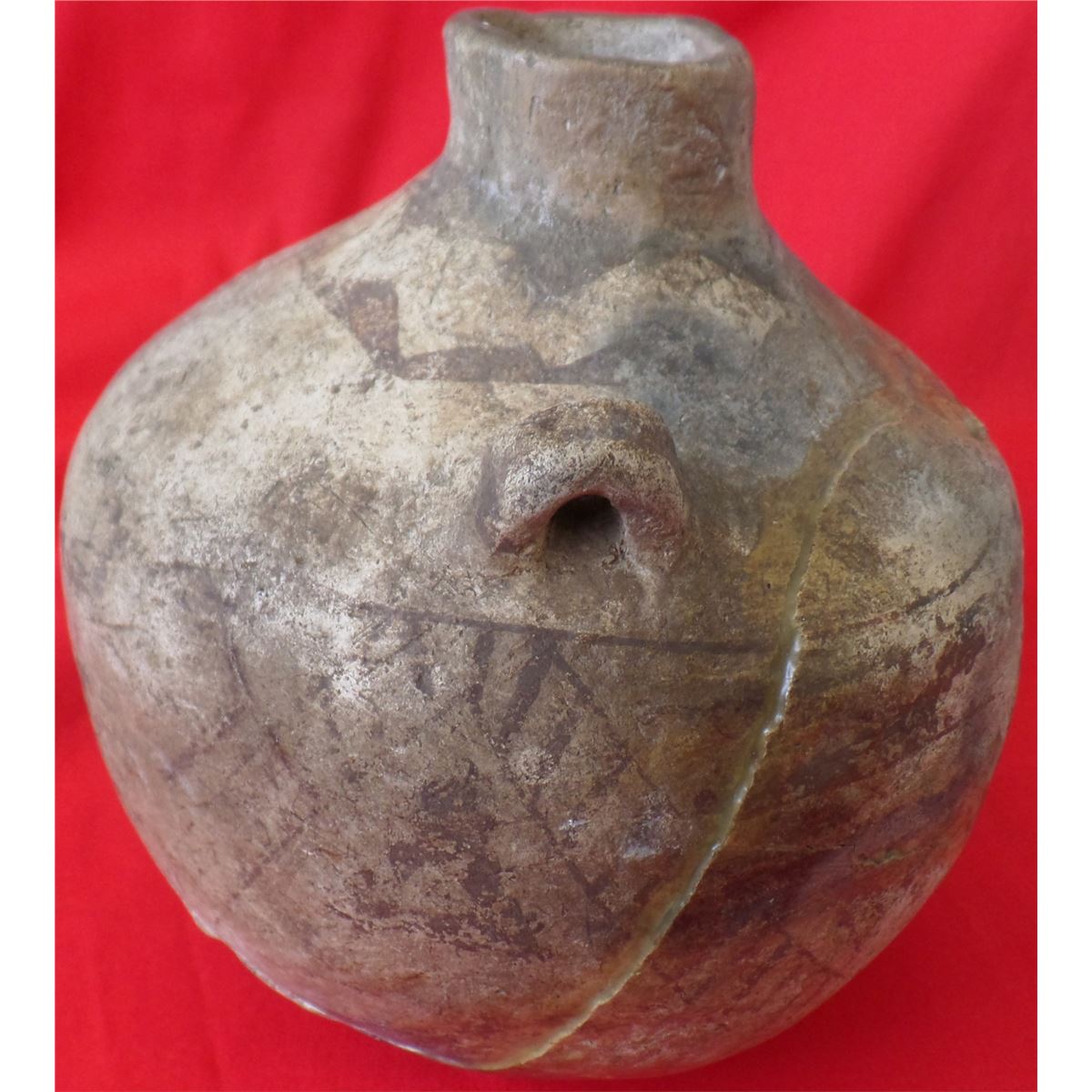 Anasazi Canteen, with documentation, measuring 6 1/2 x 7 inches. There is a lug on one side and the lug on the other side was removed in prehistoric times. It was found in pieces which have been reglued. The item was found Grants Pass, New Mexico, 11/16/2003. Shipping $25.00 Must be double boxed. Please see pictures