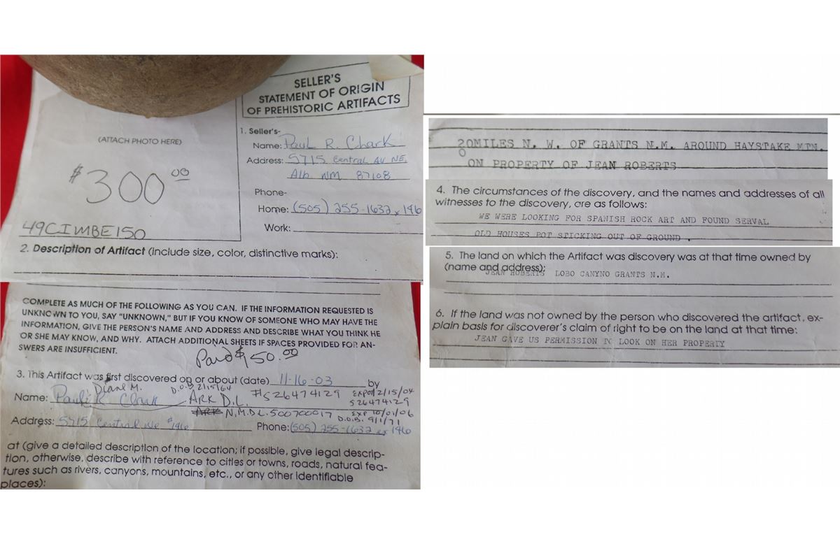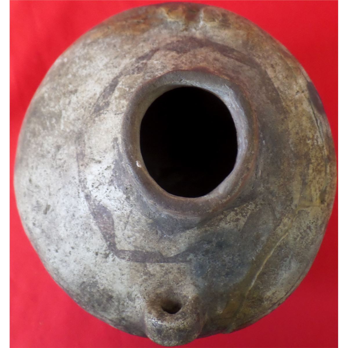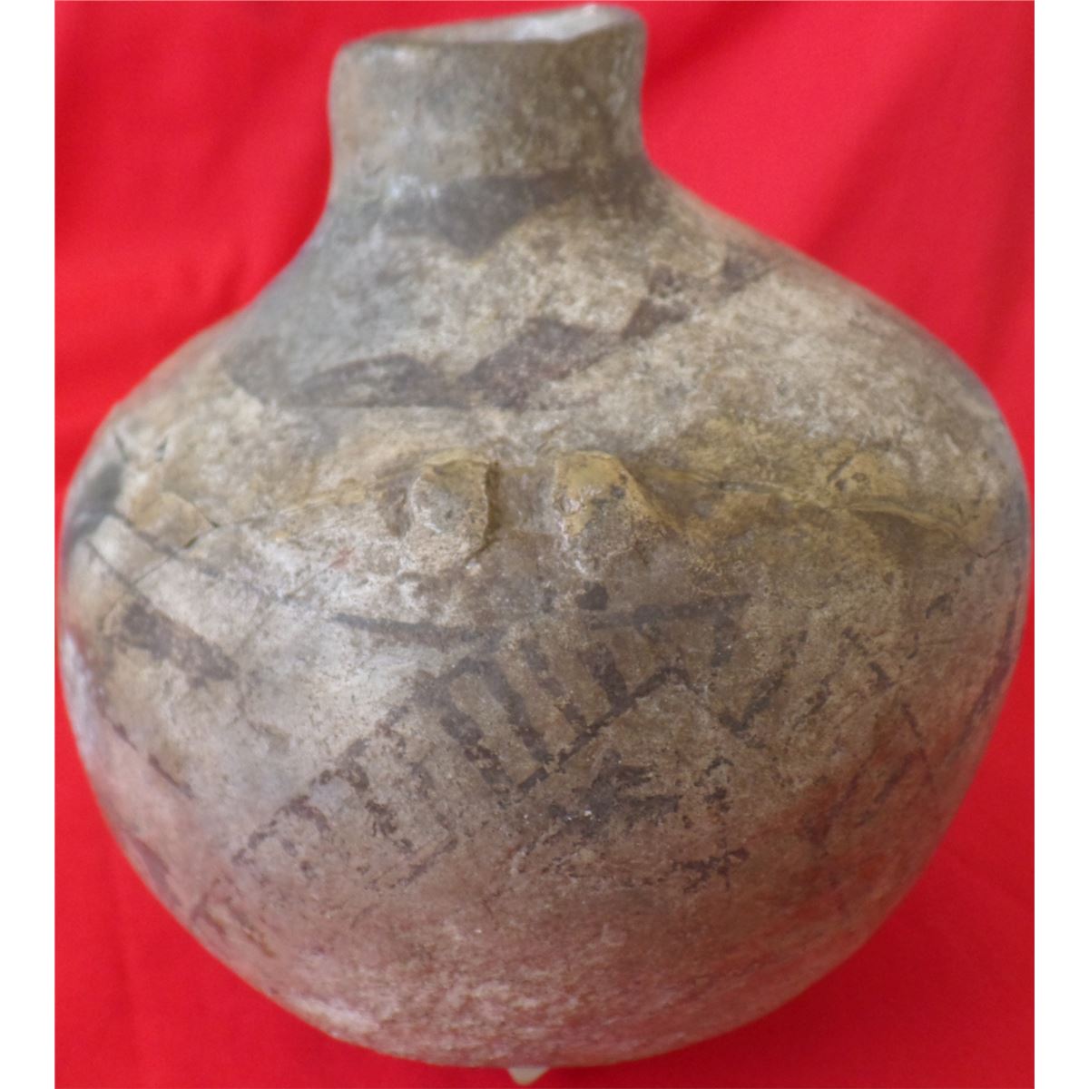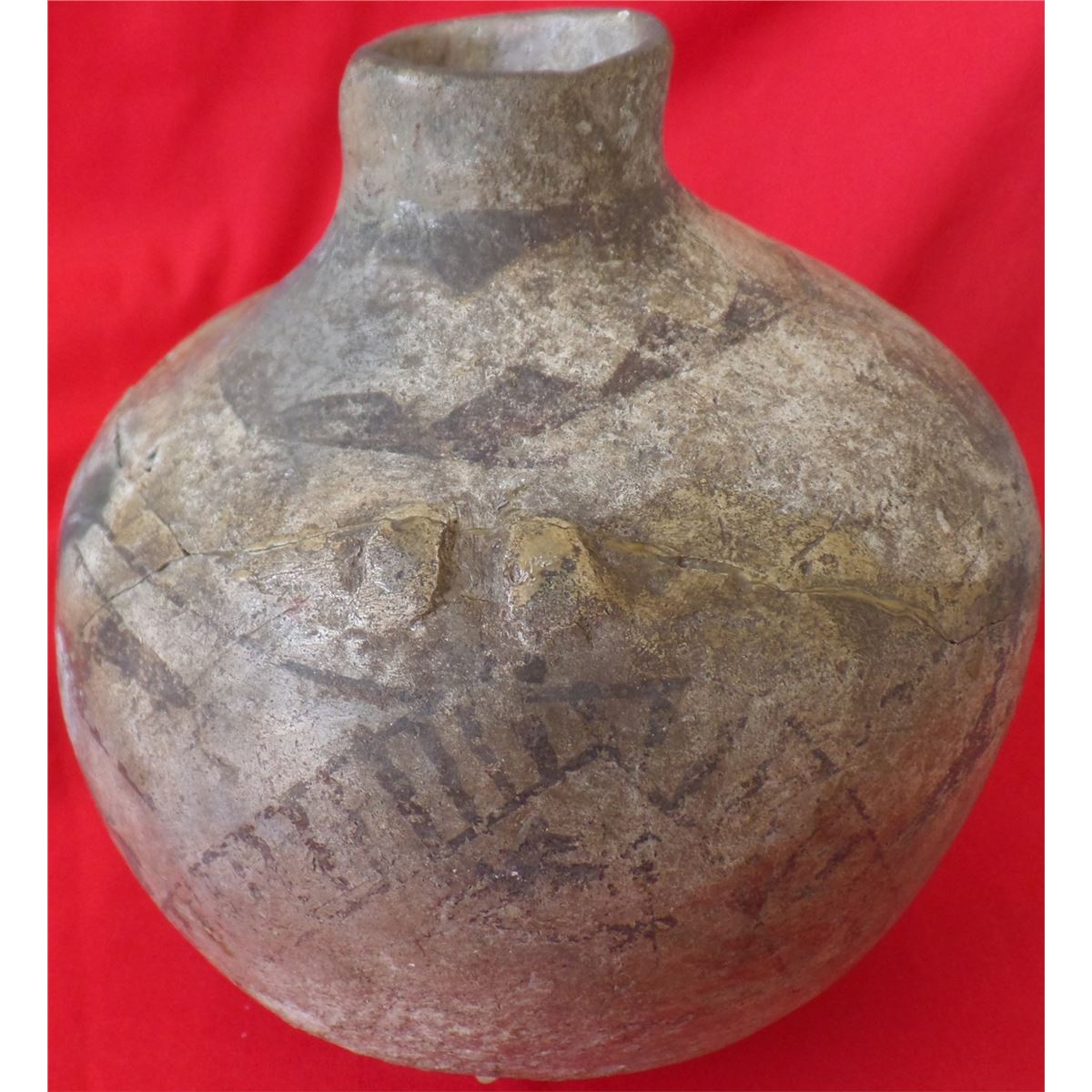 Anasazi Canteen, with documentation, measuring 6 1/2 x 7 inches. There is a lug on one side and the lug on the other side was removed in prehistoric times. It was found in pieces which have been reglued. The item was found Grants Pass, New Mexico, 11/16/2003. Shipping $25.00 Must be double boxed. Please see pictures