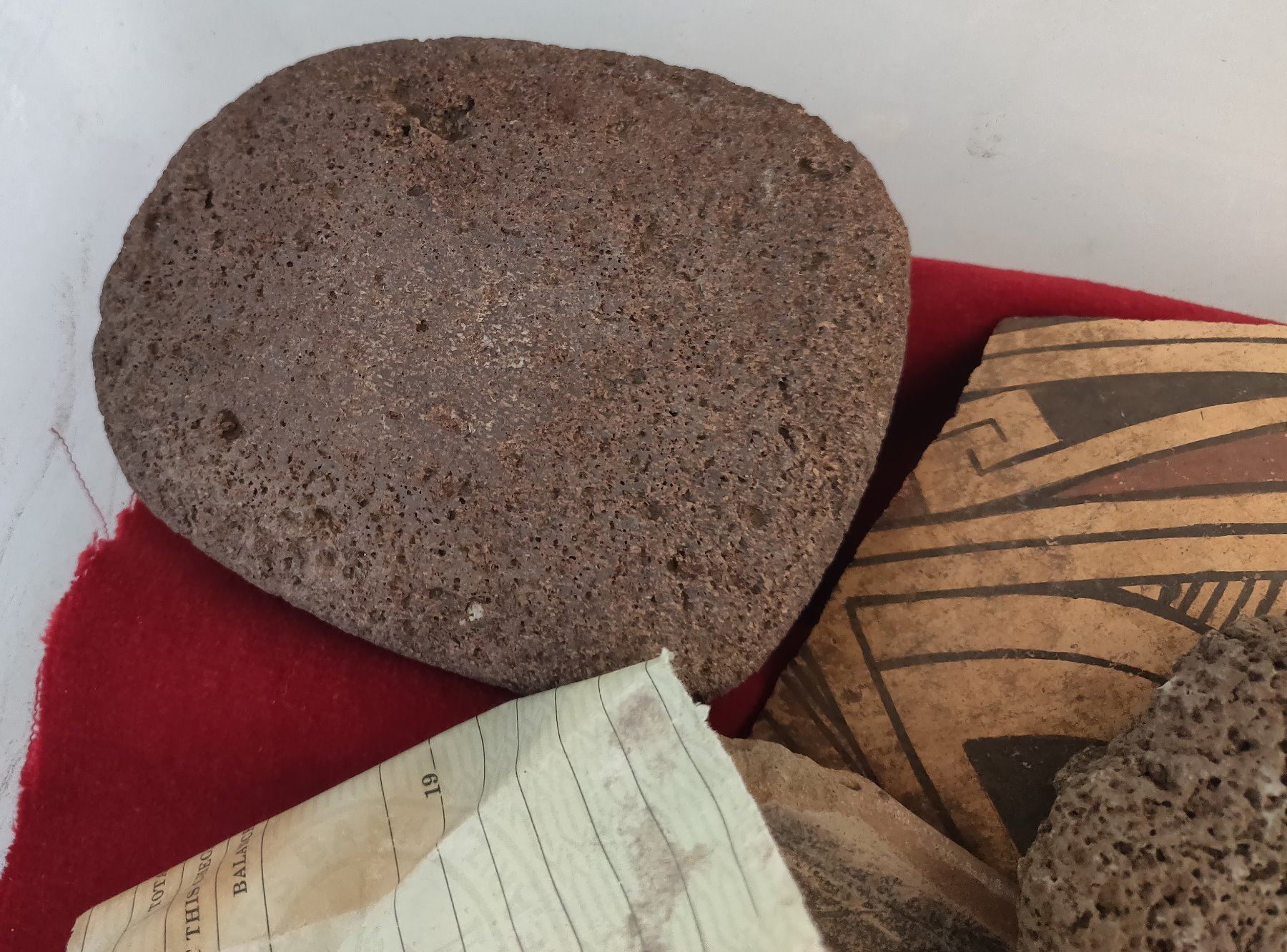 Anasazi Collection, pre-historic artifacts. Made of stone, pottery and paint, the largest piece measures 8" x 6". Southern New Mexico. Pottery and two pieces of stone, container not included. Condition: All worn and broken, see images. Shipping: $45.00 USA estimate only, w/insurance and signature, due to weight and value.
