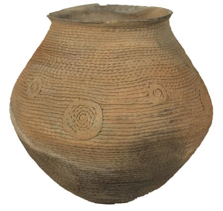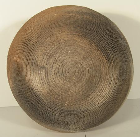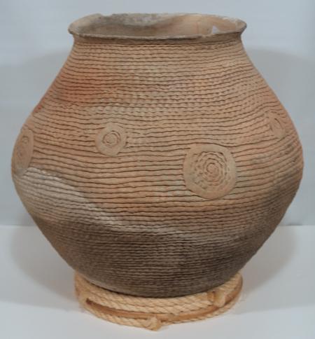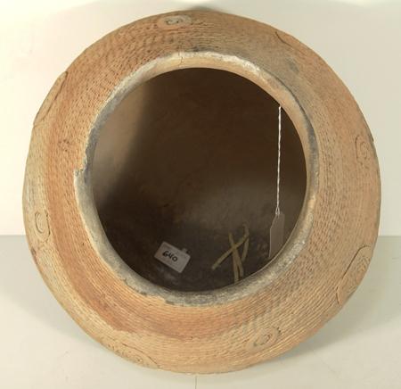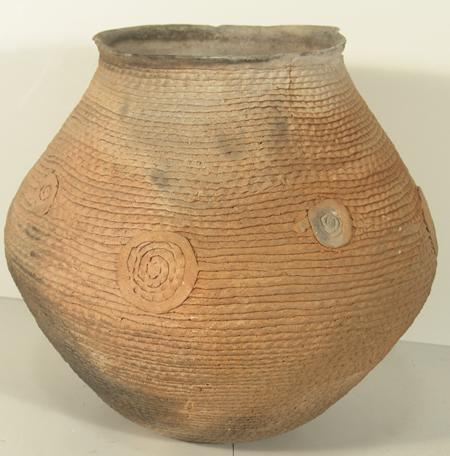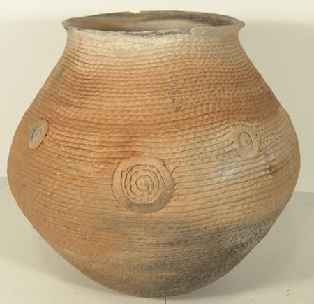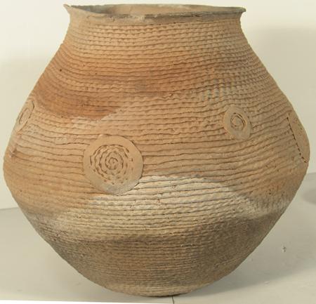 Huge wide-mouthed Mesa Verde pot with corrugated body and rare applied decorative coils. Purchased from Turney in 1975 for $880; appraisal value $2,400. Condition: very good, original. 14" high x 15" diameter
